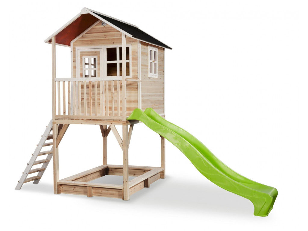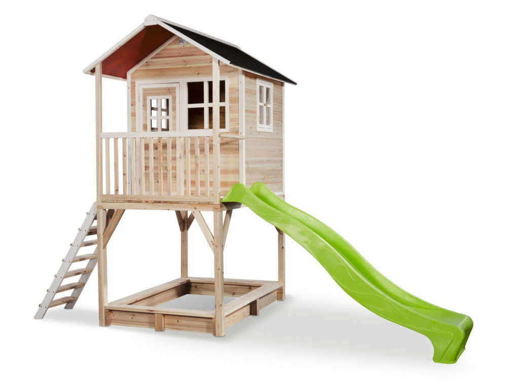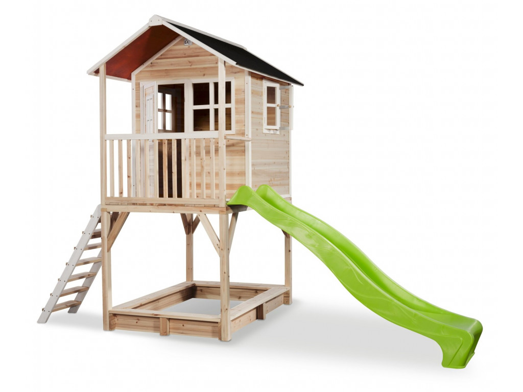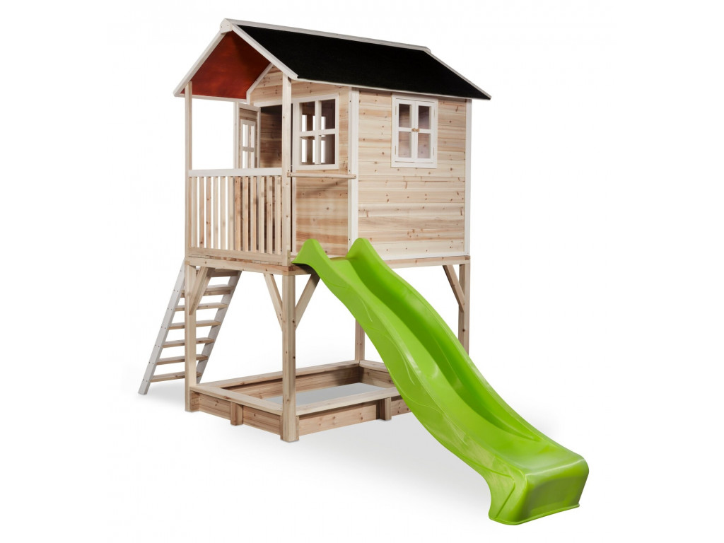 Detský drevený domček pre deti so šmykľavkou EXIT Loft 700 vyrobený v prírodnej farbe zaistí deťom dostatok zábavy. Detský domček na hranie stojí na nohách a vďaka extra zvýšeniu sa môžu deti hrať v pieskovisku pod domčekom. Disponuje rebríkom a šmykľavkou, ktoré dodajú domčeku extra zábavu. Domček so šmykľavkou na hranie sa ľahko montuje vďaka prefabrikovaným panelom. Dokážu ho poskladať 2 dospelé osoby. Pre drevený domček do záhrady EXIT Loft 700 je typický elegantný škandinávsky dizajn, do ktorého sa zamilujú všetky deti.