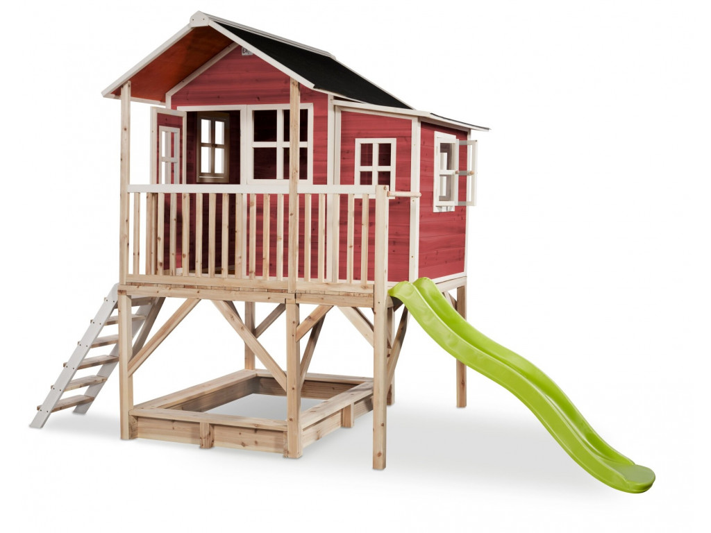Detský drevený domček pre deti EXIT Loft 550 vyrobený v červenej farbe zaistí deťom dostatok zábavy. Detský domček na hranie stojí na nohách a vďaka extra zvýšeniu sa môžu deti hrať v pieskovisku pod domčekom. Disponuje rebríkom a šmykľavkou, ktoré dodajú domčeku extra zábavu. Domček so šmykľavkou na hranie sa ľahko montuje vďaka prefabrikovaným panelom. Dokážu ho poskladať 2 dospelé osoby. Pre drevený domček na hranie EXIT Loft 550 je typický elegantný škandinávsky dizajn, do ktorého sa zamilujú všetky deti.