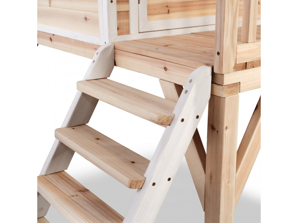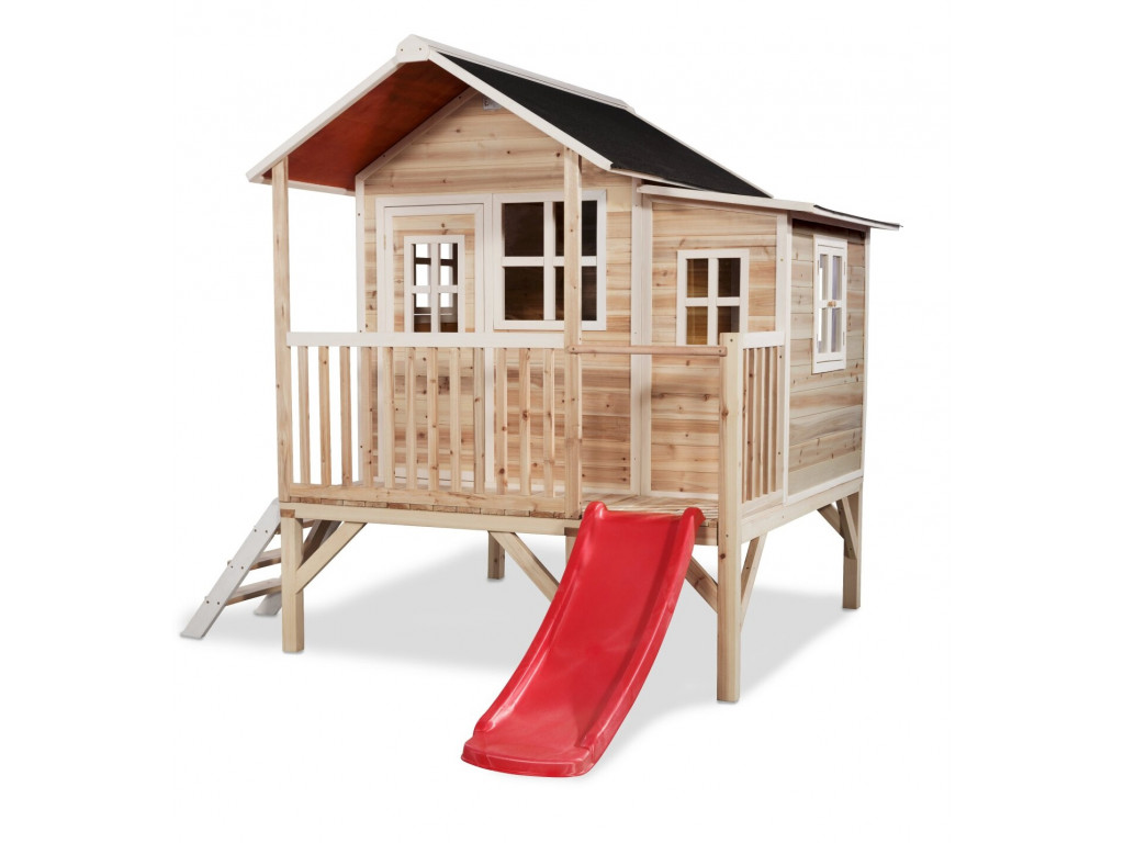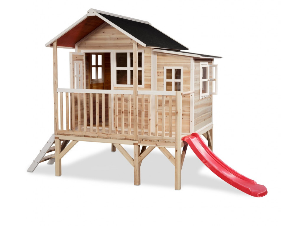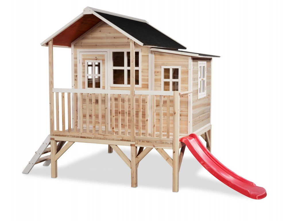 Detský drevený domček pre deti EXIT Loft 350 vyrobený v prírodnej farbe zaistí deťom dostatok zábavy. Detský domček na hranie stojí na nohách. Disponuje rebríkom a šmykľavkou, ktoré dodajú domčeku extra zábavu. Domček na hranie sa ľahko montuje vďaka prefabrikovaným panelom. Dokážu ho poskladať 2 dospelé osoby. Pre drevený domček na hranie EXIT Loft 350 je typický elegantný škandinávsky dizajn, do ktorého sa zamilujú všetky deti.
