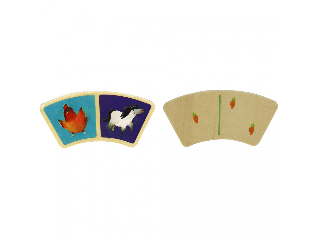 Sada drevených dielikov domina s motívom farmy. Domino je originálne vďaka oblúkovitému tvaru jednotlivých dielikov a dostatočnej veľkosti i pre najmenšie deti. Obsahuje 28 drevených častí. Vďaka farebnosti, toto domino deti len tak neomrzí.