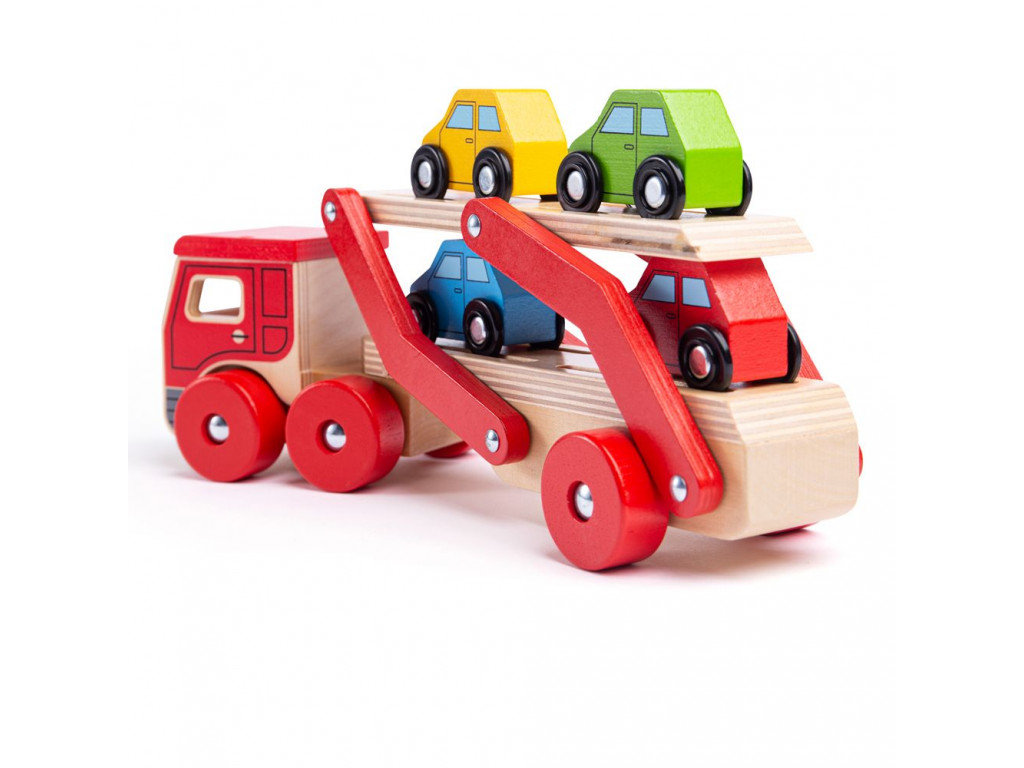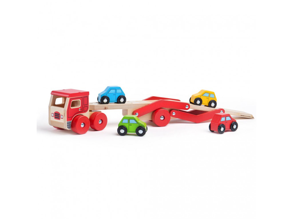Tento drevený transportér pomáha rozvíjať obratnosť a koordináciu. Kamión vezie náklad štyroch pestrofarebných drevených áut. Hornú časť návesu je možné jednoducho znížiť, aby naň mohlo vyjsť každé vozidlo. Drážky v podlahe pomáhajú udržať každé auto na mieste, keď je prepravované na miesto určenia. Vyrobené z vysoko kvalitných, zodpovedne získaných materiálov. Spĺňa aktuálne európske bezpečnostné normy.