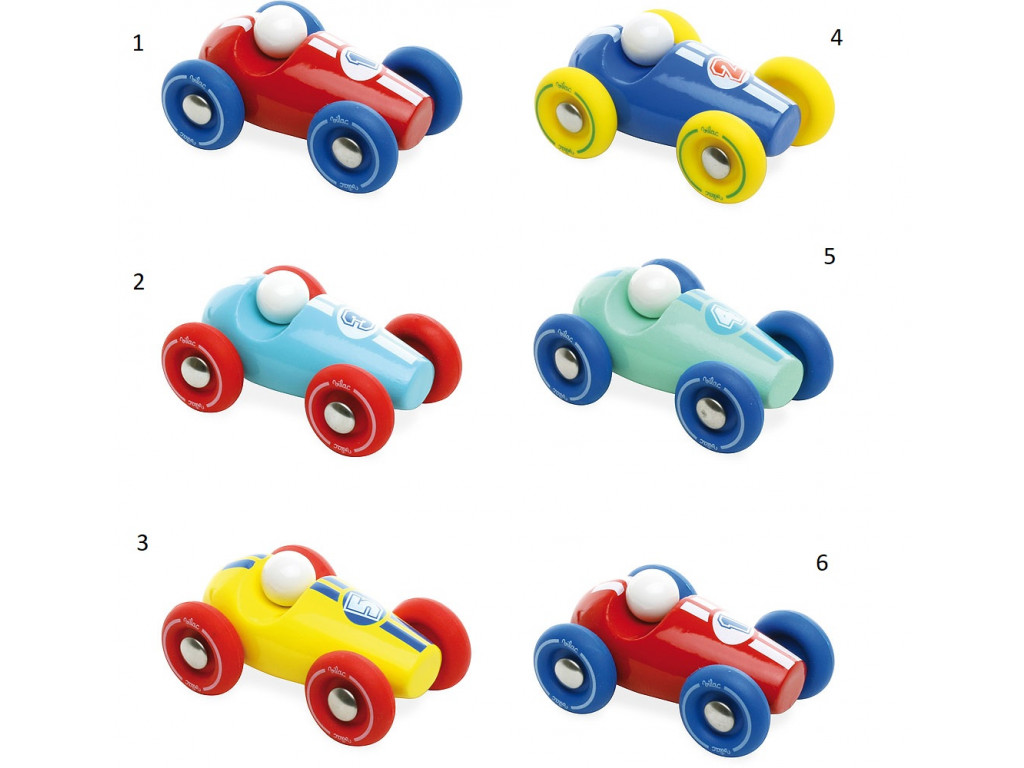 Drevené pretekárske autíčko vyrobené z lakovaného dreva, s gumovými kolesami, ktoré zabezpečujú tichý chod po podlahe. Je vhodné ako na hranie, tak ako dekorácia do izieb detí či dospelých. Vyrobené vo Francúzsku.
