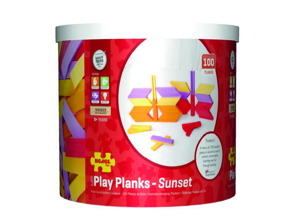 Vyskladajte si scenérie, predmety a budovy podľa vlastnej fantázie z drevených dosiek v žltej, oranžovej, fialovej a červenej farbe západu slnka. Stavebnica detskej kreativite nekladie žiadne medze, a tak drobcom poskytne hodiny plné zábavy.