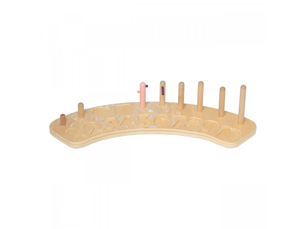 Veľká a pestrofarebná vkladačka s drevenou základňou a kolíkmi. Úlohou detí je priradiť správne poradie čísliciam a následne na kolíky nasadzovať prislúchajúce počty dielikov. Motorická hračka podporuje spoznávanie farieb, čísel a rôznych tvarov. Vyrobená z odolného dreva.