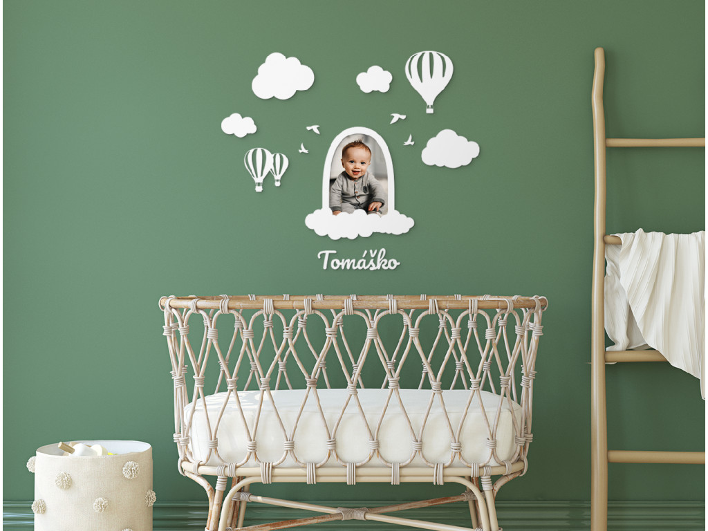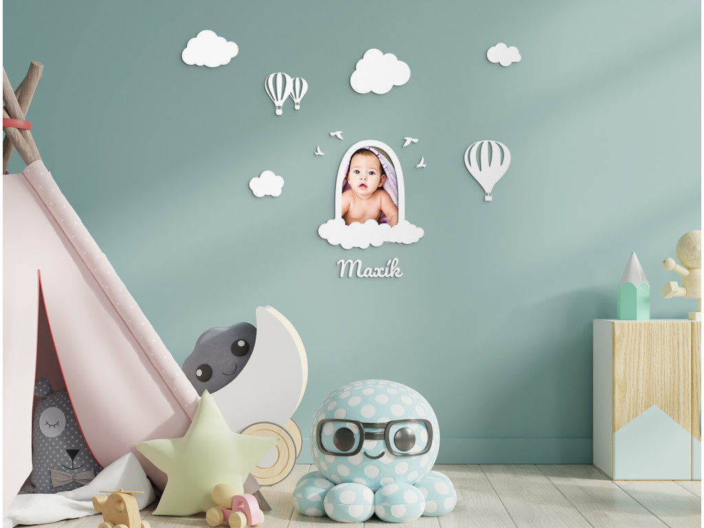 Portrét vášho malého drobca môžete mať doma vystavený aj vďaka originálnemu fotorámiku, ktorý je zároveň roztomilou dekoráciou. Drevený fotorámik do detskej izby obsahuje aj balóny, obláčiky, vtáčiky a meno bábätka, ktoré si môžete ľubovoľne rozmiestniť a nalepiť napríklad nad postieľku.