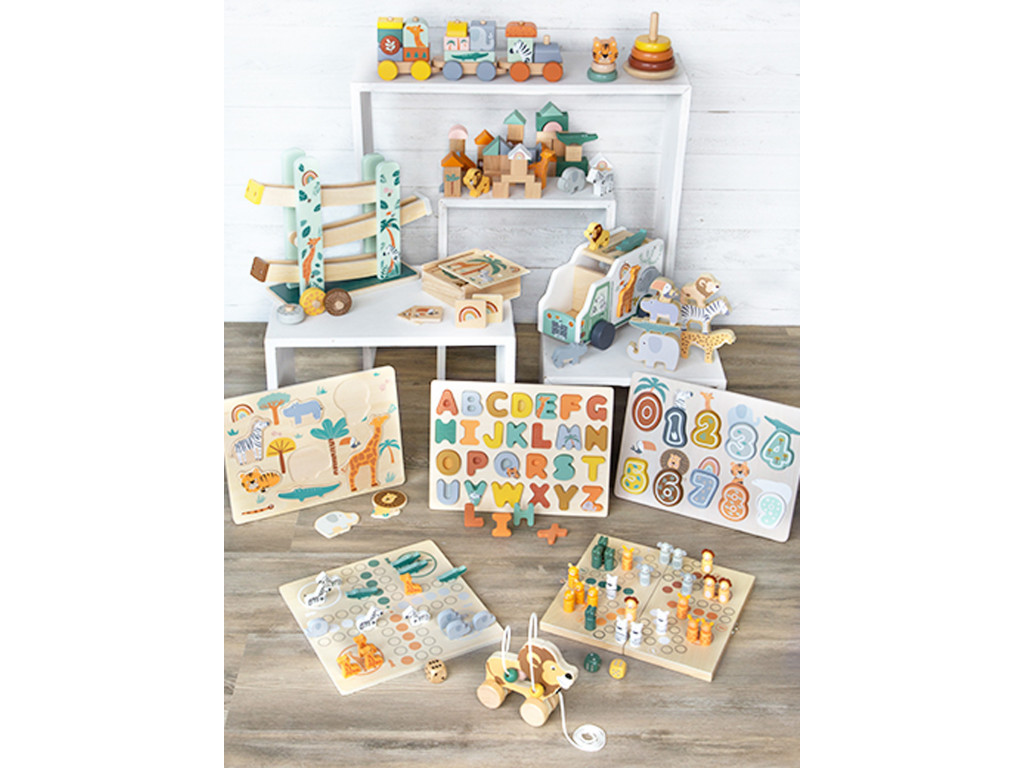 Kotúľajú sa prírodou, naberajú rýchlosť. Tri drevené kolieska s rozdielnou ilustráciou a vzormi sa kotúľajú dole po troch rampách. Dráha je dekorovaná ilustráciami safari zvierat a rastlín z džungle. Krásna hračka, ktorá sľubuje dlhotrvajúcu zábavu.