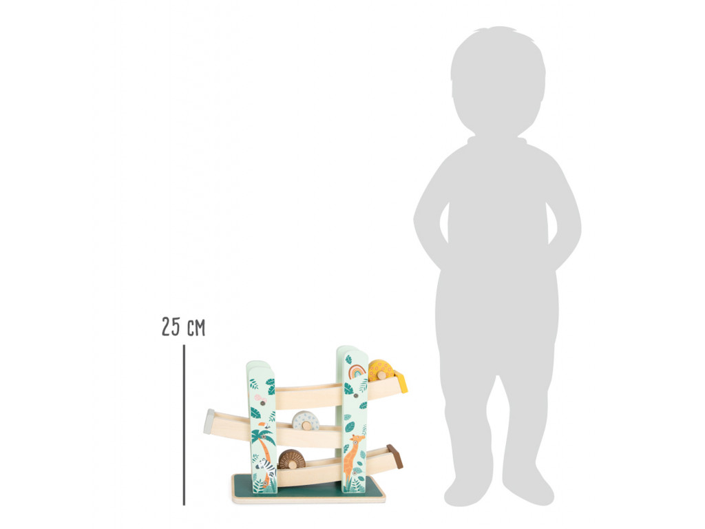 Drevená dráha Safari sľubuje dlhotrvajúcu zábavu pre malé deti. Je krásne dekorovaná ilustráciami safari zvierat a rastlín z džungle. K dispozícii sú 3 kotúčiky, ktoré sa kotúľajú dole po troch rampách.