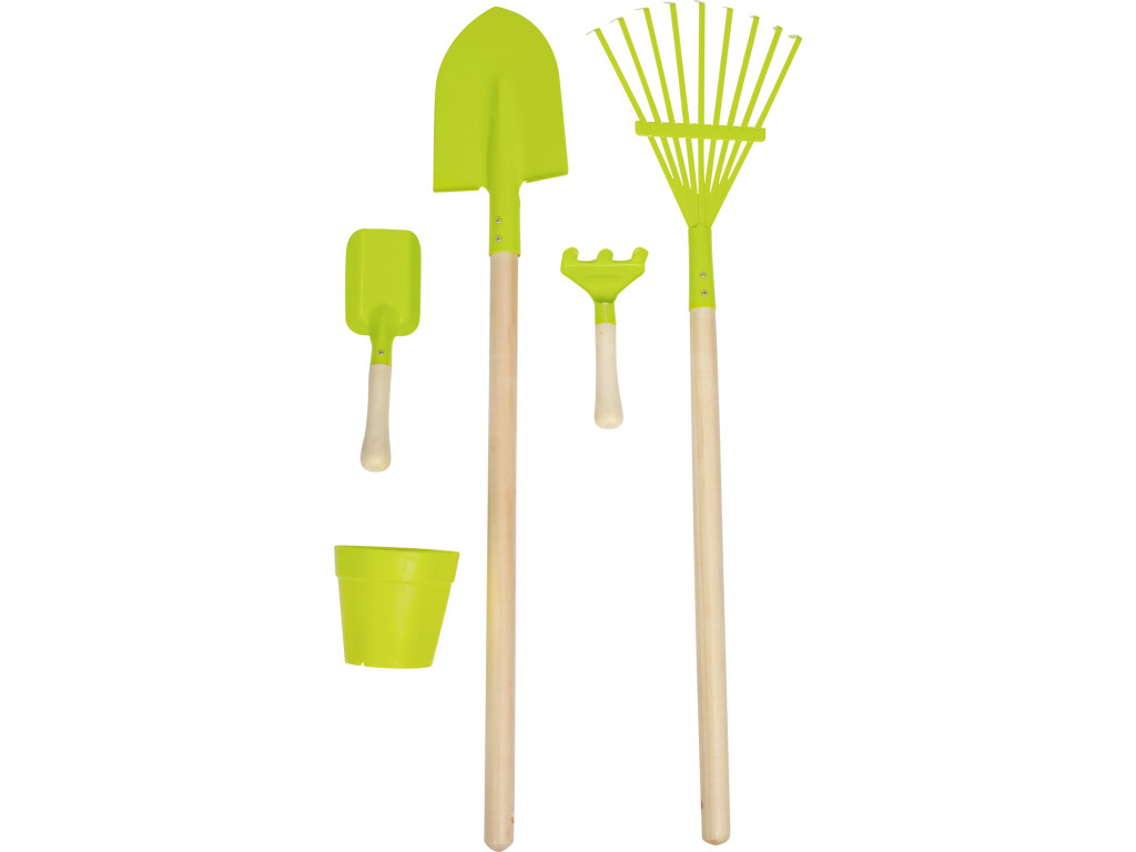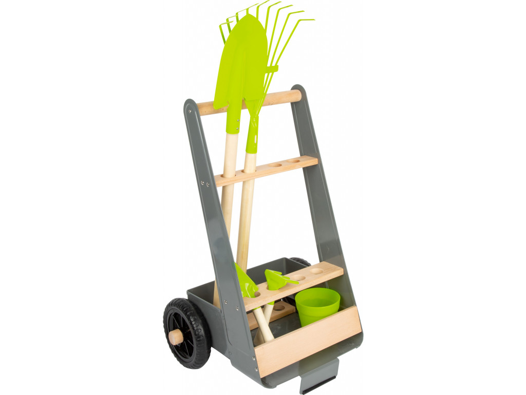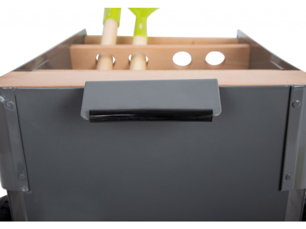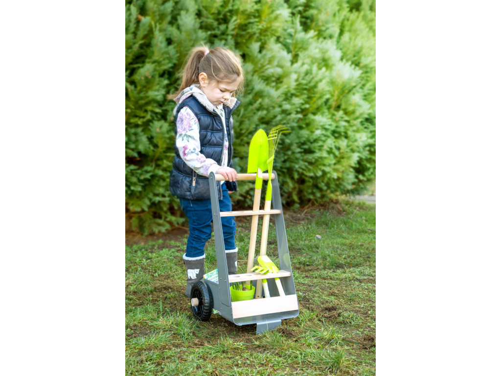 Mladí nadšení záhradníci a záhradníčky teraz môžu začať pracovať na svojom vysnívanom záhone. Stabilný vozík vyrobený z bukového dreva a kovu je možné jednoducho tlačiť či ťahať po záhrade, má na to totiž stavané kolesá. Dobre premyslený dizajn myslel na úložný priestor, vzhľad aj bezpečnosť. Hrable, rýľ aj lopata môžu byť uložené tak, aby smerovali preč od hlavy dieťaťa.