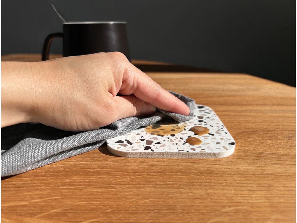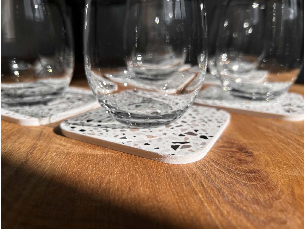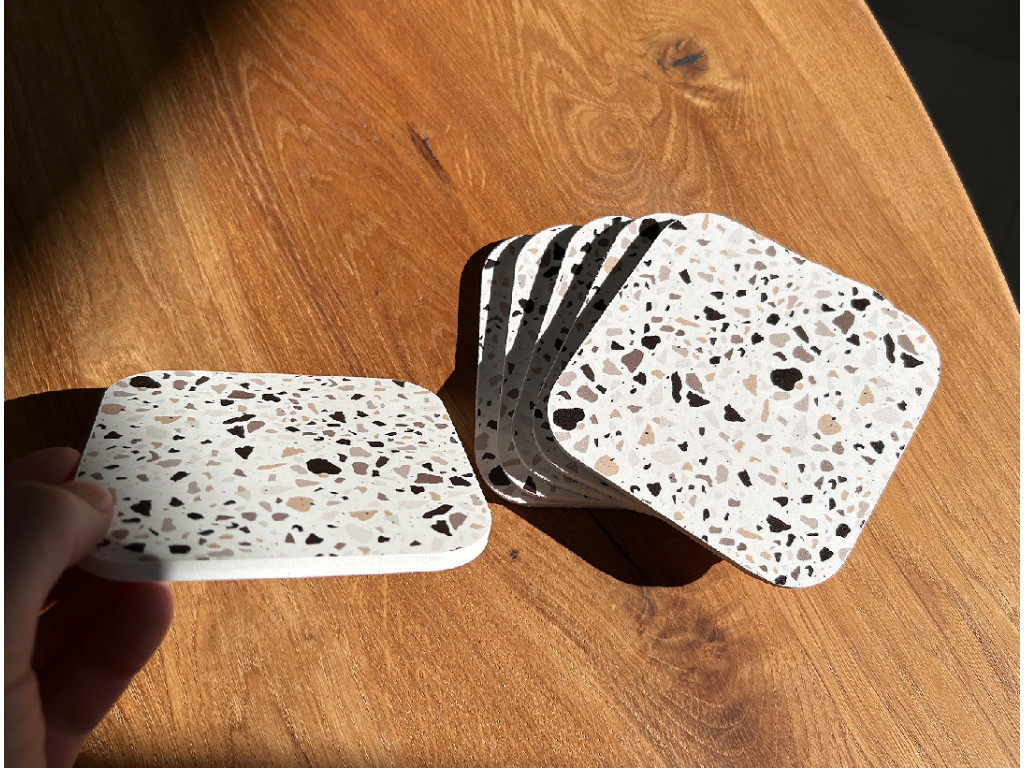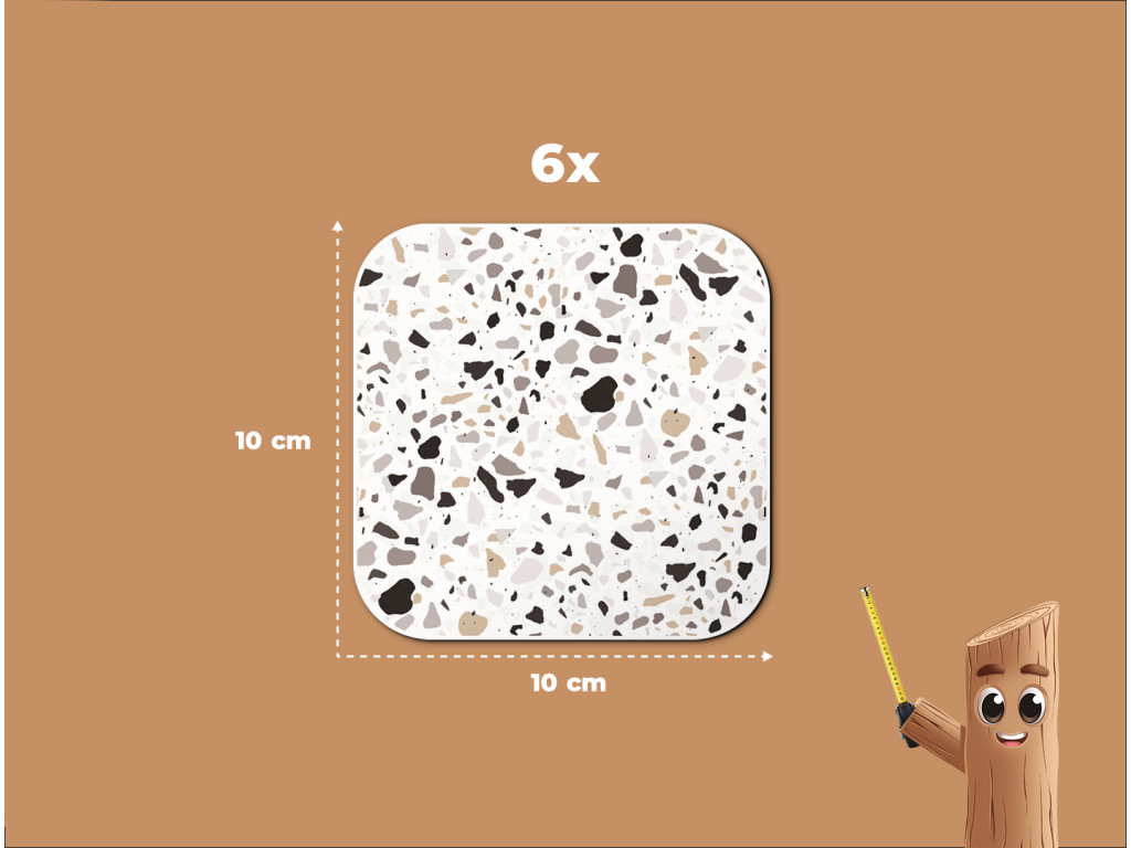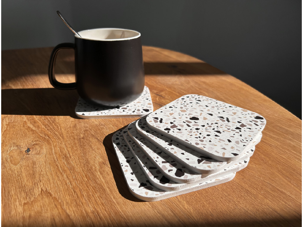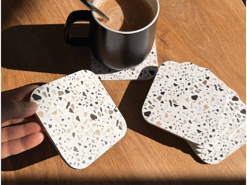 Každý podtáčok má rozmer 10 × 10 cm, hrúbku 5 mm a zaoblené rohy, ktoré pôsobia elegantne a zároveň sú príjemné na dotyk. Ich terrazzo vzor dodá priestoru moderný a svieži charakter, ktorý sa krásne hodí do minimalistických aj hravých interiérov.