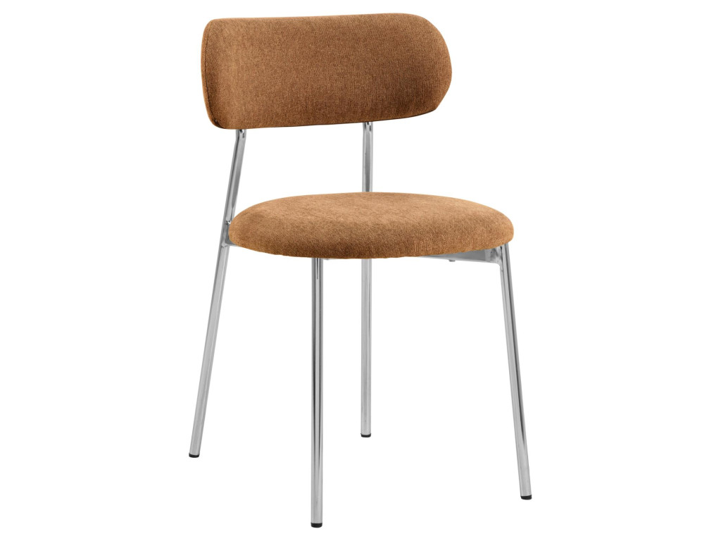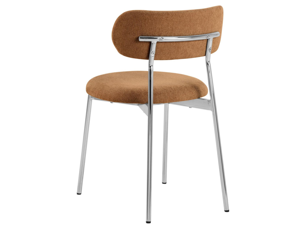 Táto jedálenská stolička stelesňuje retro-futuristickú estetiku a vnáša hravosť do každej jedálne. Jej rúrkový rám a nohy sú vyrobené z lesklej chrómovanej ocele. Pre zvýraznenie jemnej stránky dizajnu je zaoblené sedadlo potiahnuté terakotovou látkou podobnou ženilke. Je to pútavý dizajn, ktorý pri jedálenskom stole prináša vzrušenie.