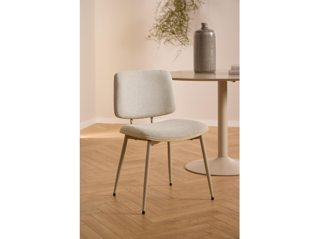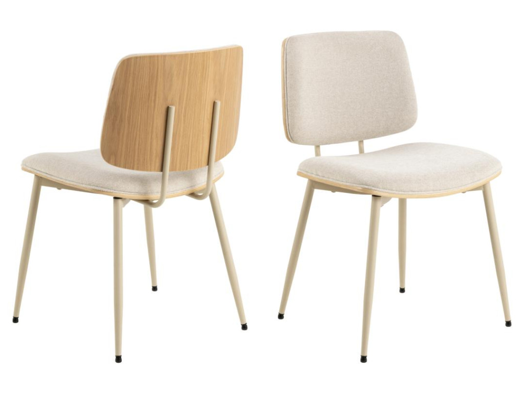 Jedálenská stolička Owen prináša jemnú, nadčasovú estetiku, ktorá spája prírodné materiály s modernými prvkami. Sedadlo a operadlo z ohýbanej lakovanej dubovej dyhy vytvárajú teplý, prívetivý vzhľad, zatiaľ čo béžová látka dopĺňa celkový komfort. Dve sivé rúrky spájajúce sedadlo s operadlom dodávajú stoličke štíhlu siluetu a sivé oceľové nohy s hrubým práškovým nástrekom zabezpečujú stabilitu. Dodáva sa ako sada 2 kusov.