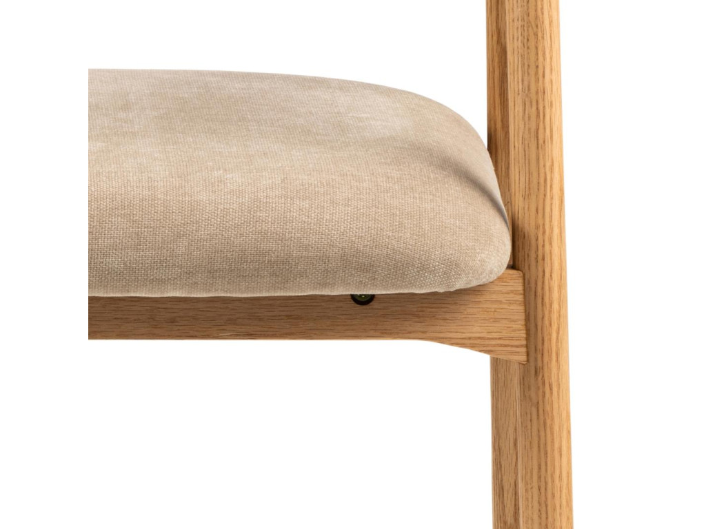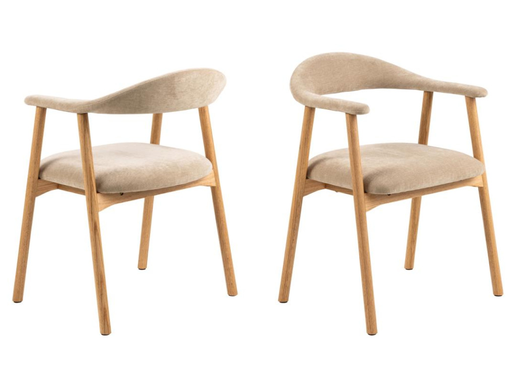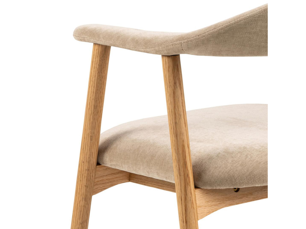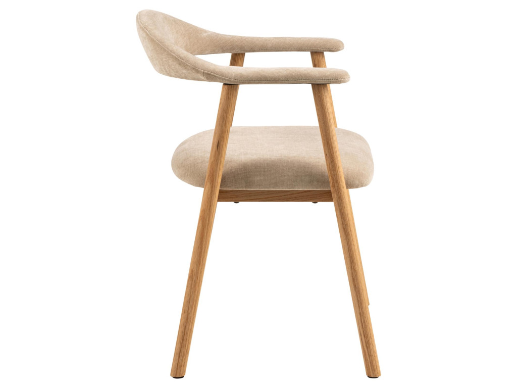 Kreslo Addi s lakťovou opierkou spája pohodlie a elegantný dizajn. Béžový textilný poťah v kombinácii s masívnym olejovaným dubovým rámom pôsobí prirodzene a nadčasovo. Vhodné ako súčasť útulnej jedálne alebo kuchyne.