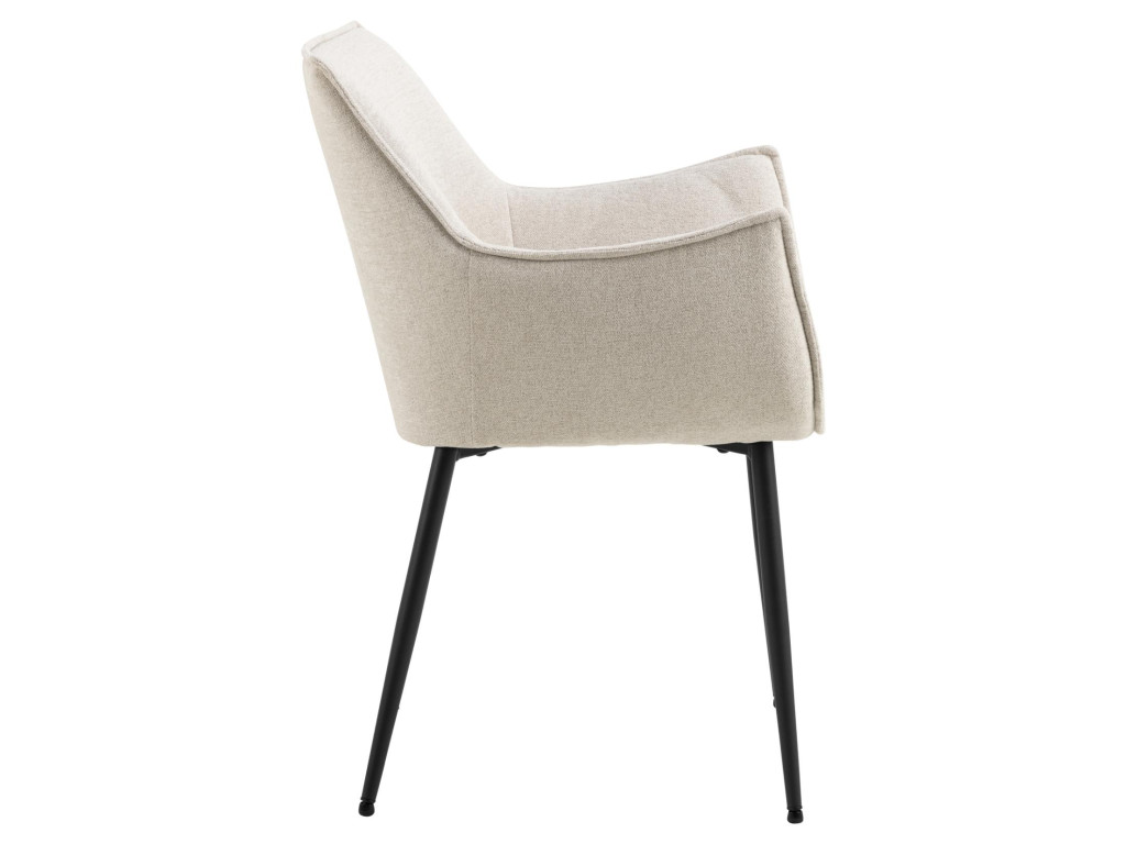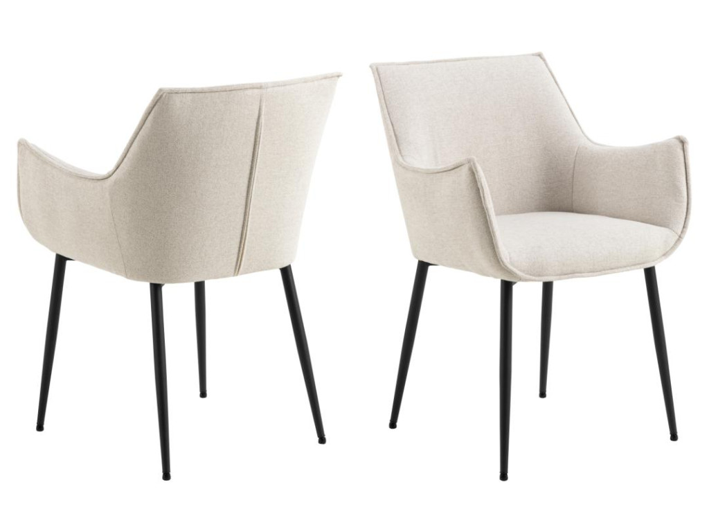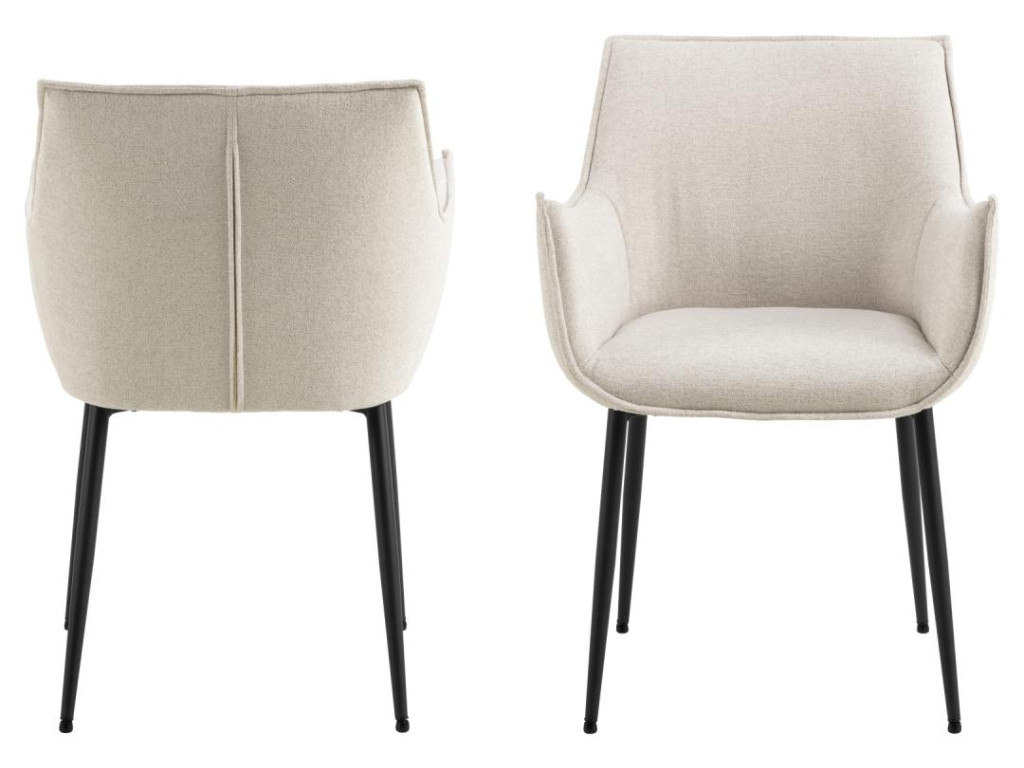 Kreslo Bonita s lakťovou opierkou ponúka pohodlie a štýl v béžovom čalúnení. Elegantné francúzske prešívanie a zips zvýrazňujú jeho dizajnový charakter. Čierna kovová konštrukcia zaisťuje stabilitu. Balenie obsahuje dve stoličky.