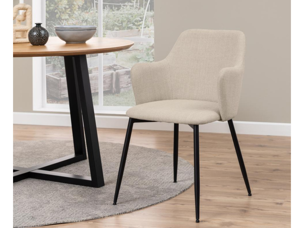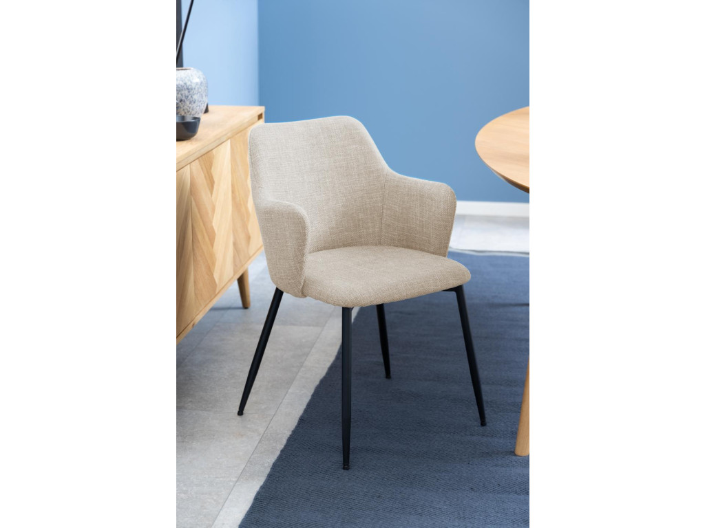 Kreslo Ilsa v béžovej farbe pôsobí útulne a elegantne. S čiernou oceľovou základňou a doplnkami ako gombík či zips je štýlovým doplnkom do každej modernej jedálne.