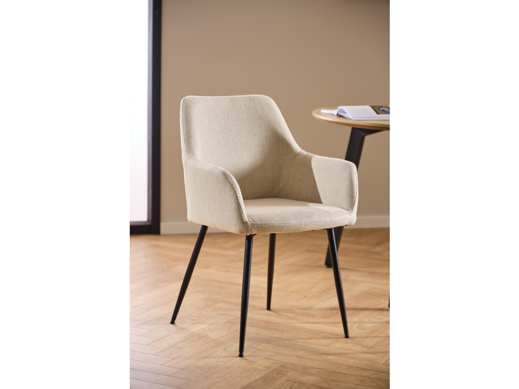 Stolička Lizzy s lakťovými opierkami v béžovej farbe pôsobí elegantne a moderne. Kovová základňa a zipsové detaily zvyšujú vizuálnu atraktivitu. Vhodná do domácich i komerčných jedální. Komfort zabezpečuje kvalitné čalúnenie a pevná konštrukcia.