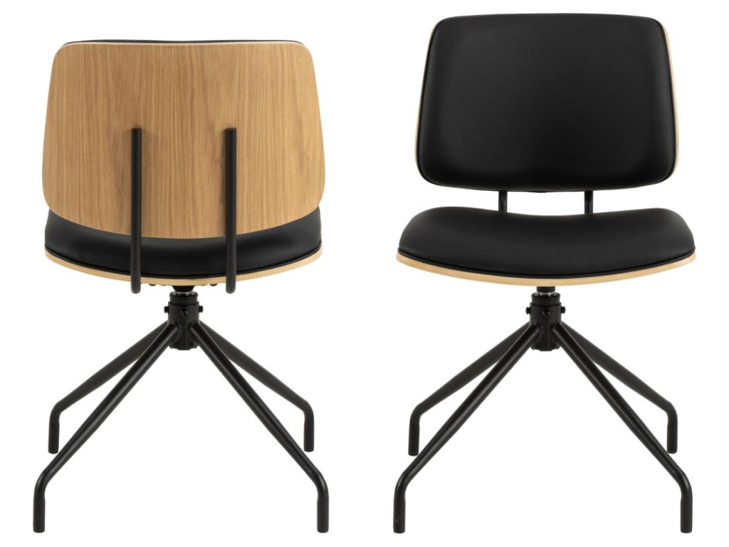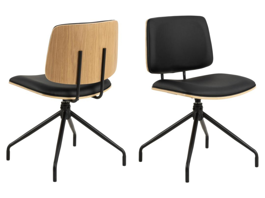 Stolička Owen v čiernej ekokoži a dubovej dyhe pôsobí štýlovo a moderne. Vybavená otočným mechanizmom a čiernou kovovou hviezdicovou základňou. Ideálna do jedálenského priestoru aj kancelárie. Balenie obsahuje 2 kusy.