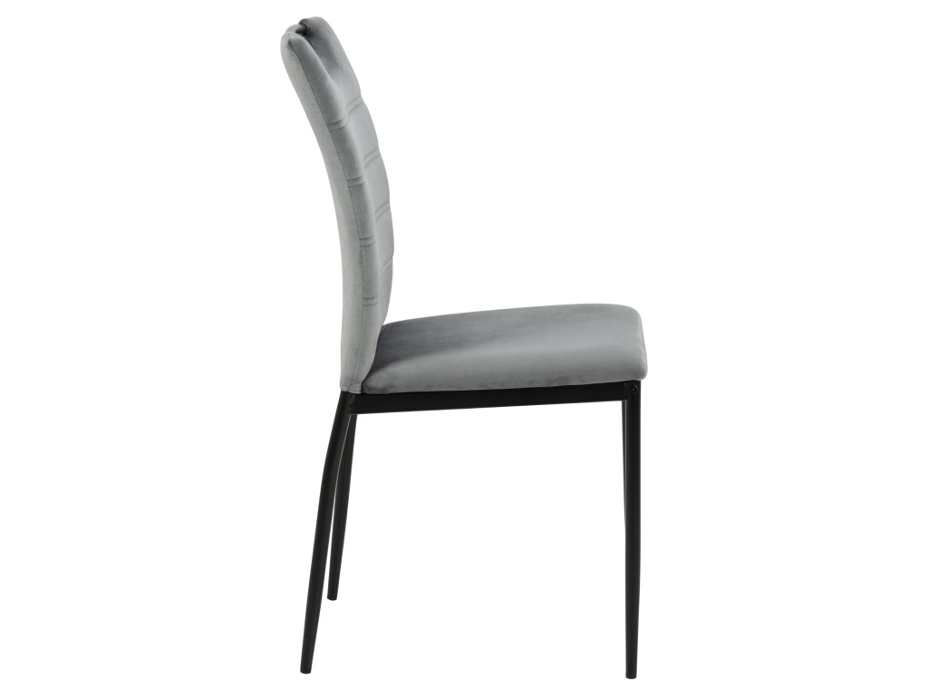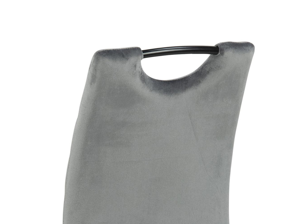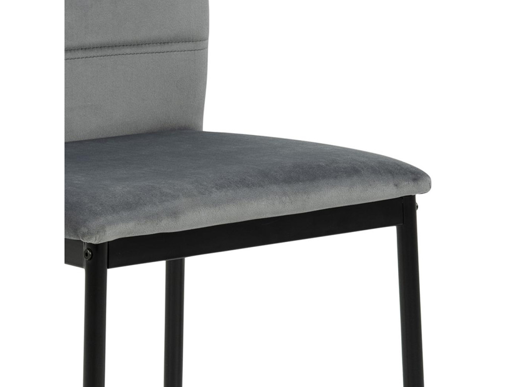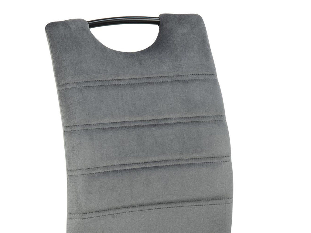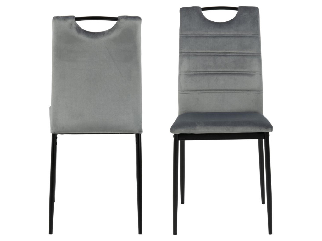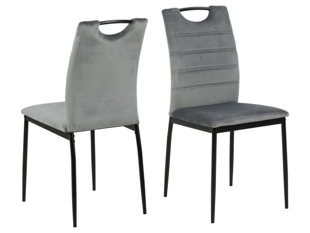 Stoličky Dia zaujmú praktickým dizajnom s horizontálnym prešívaním a čalúnením. Tmavosivá látka a čierna oceľ vytvárajú elegantný kontrast. Ergonomický tvar s opierkou chrbta a rukoväťou zabezpečuje pohodlie. Balenie obsahuje štyri kusy – ideálne pre rodinné stolovanie.
