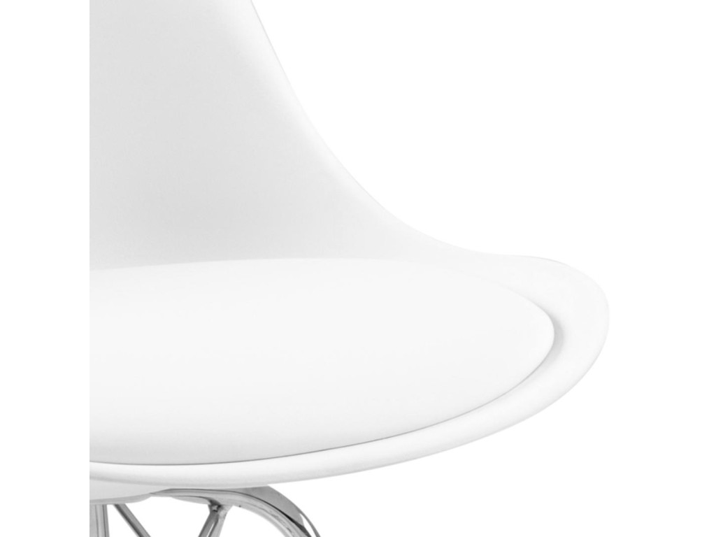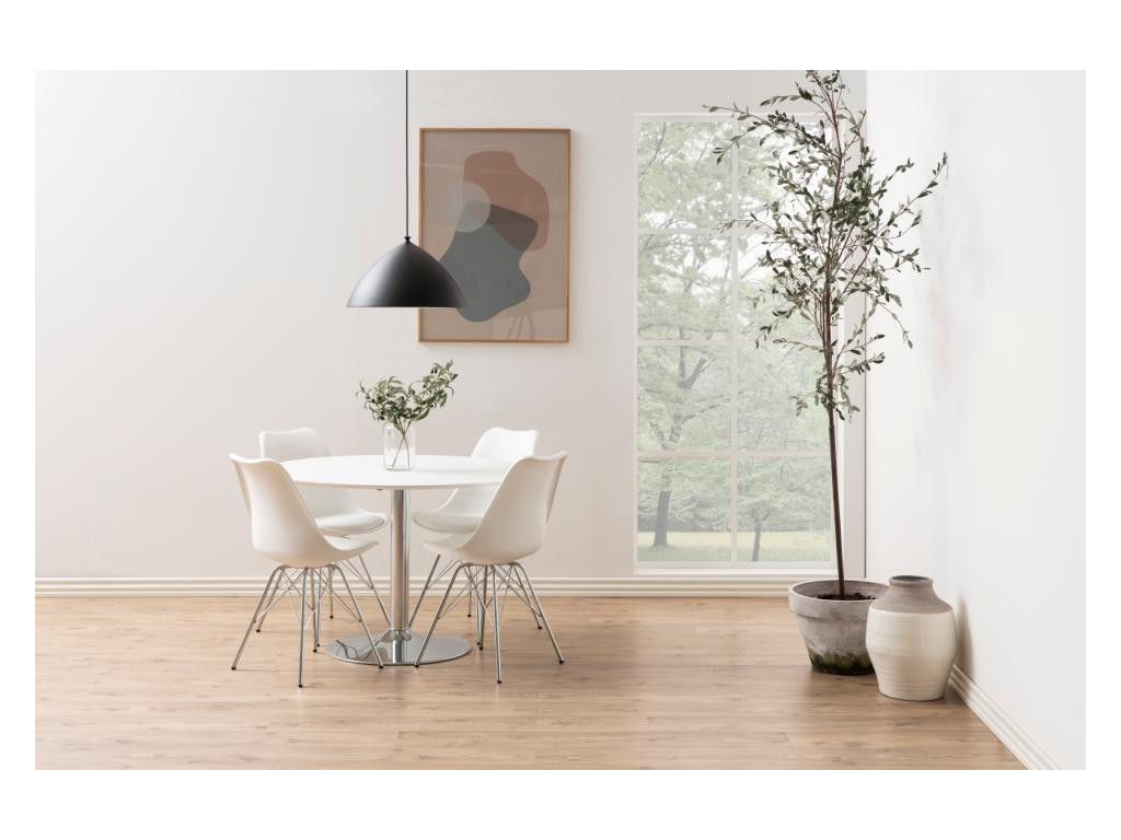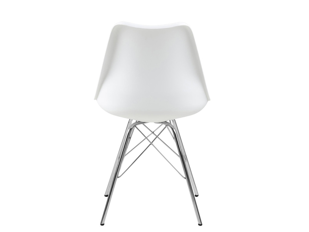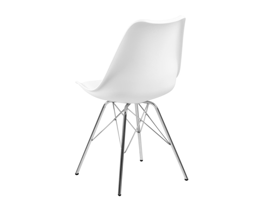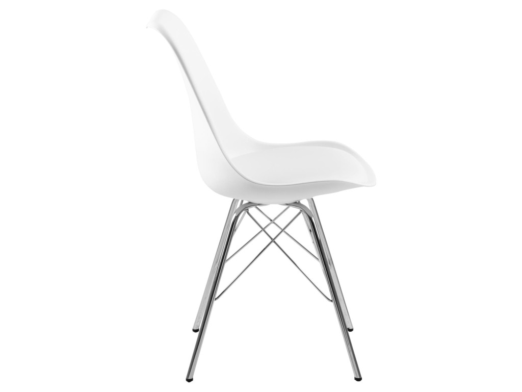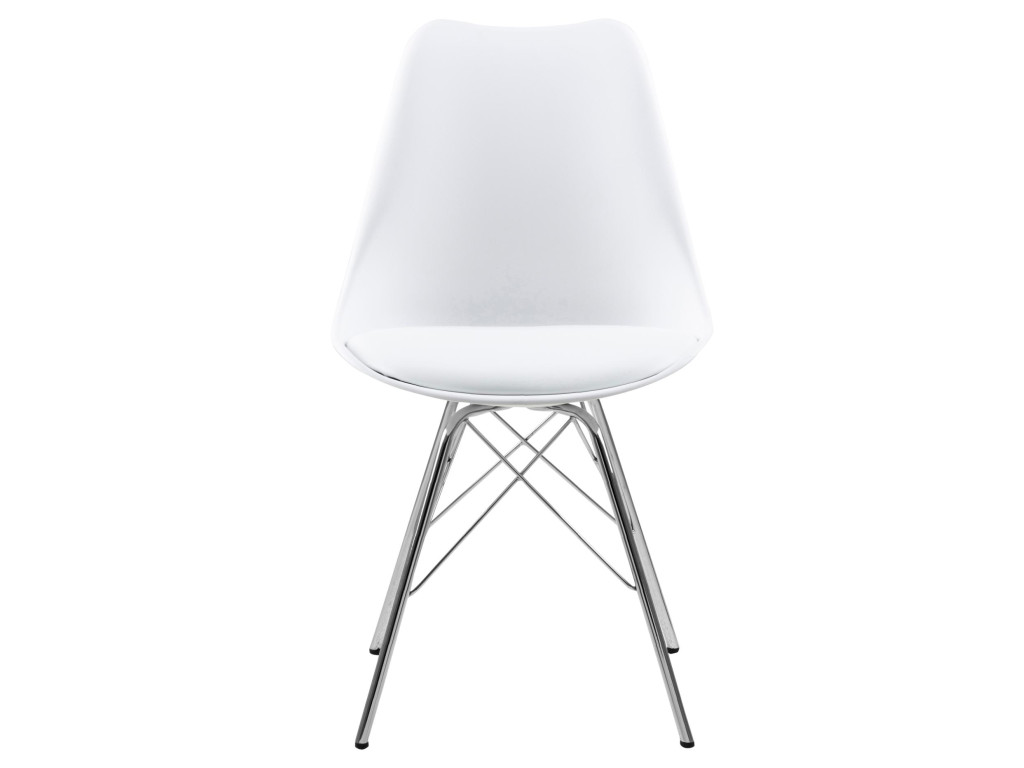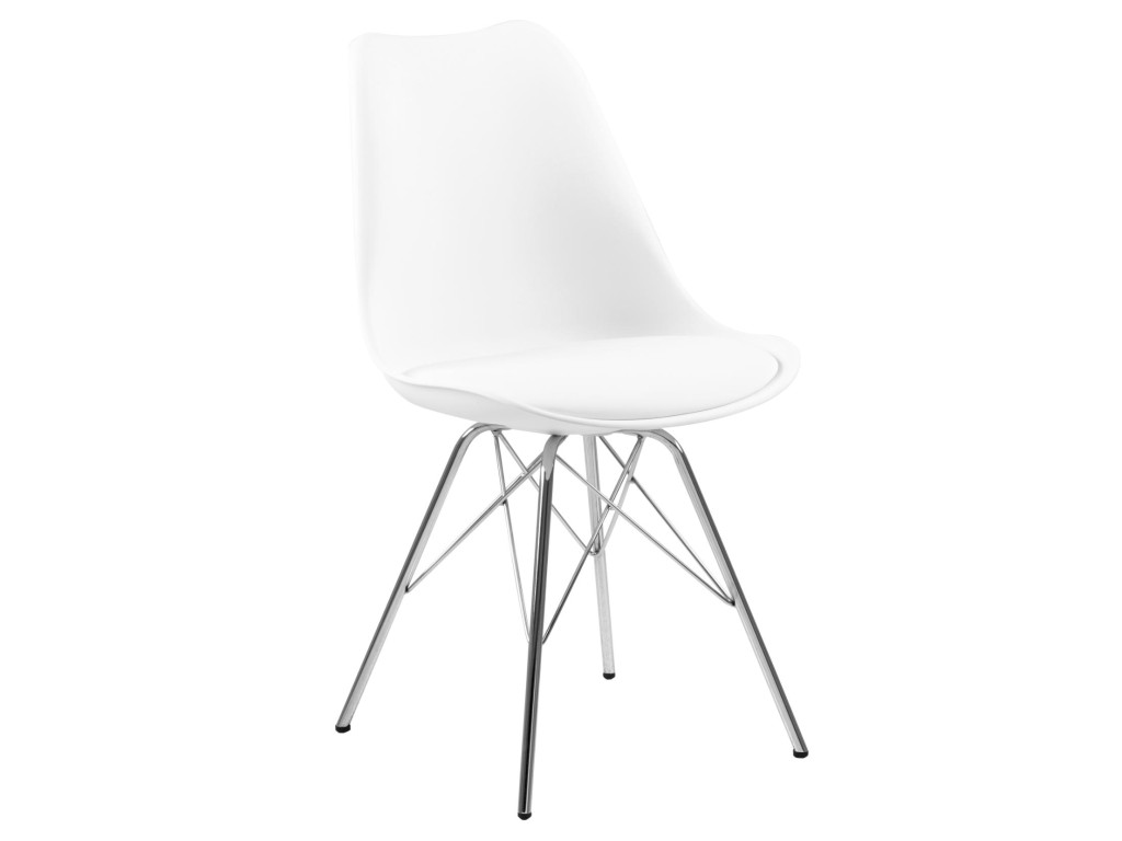 Biela stolička Eris pôsobí čisto, sviežo a moderne. Ekokoža je príjemná na dotyk a ľahko sa udržiava. Chrómové nohy dodávajú jemný lesk a stabilitu. Skvelá voľba do svetlých a minimalistických interiérov.