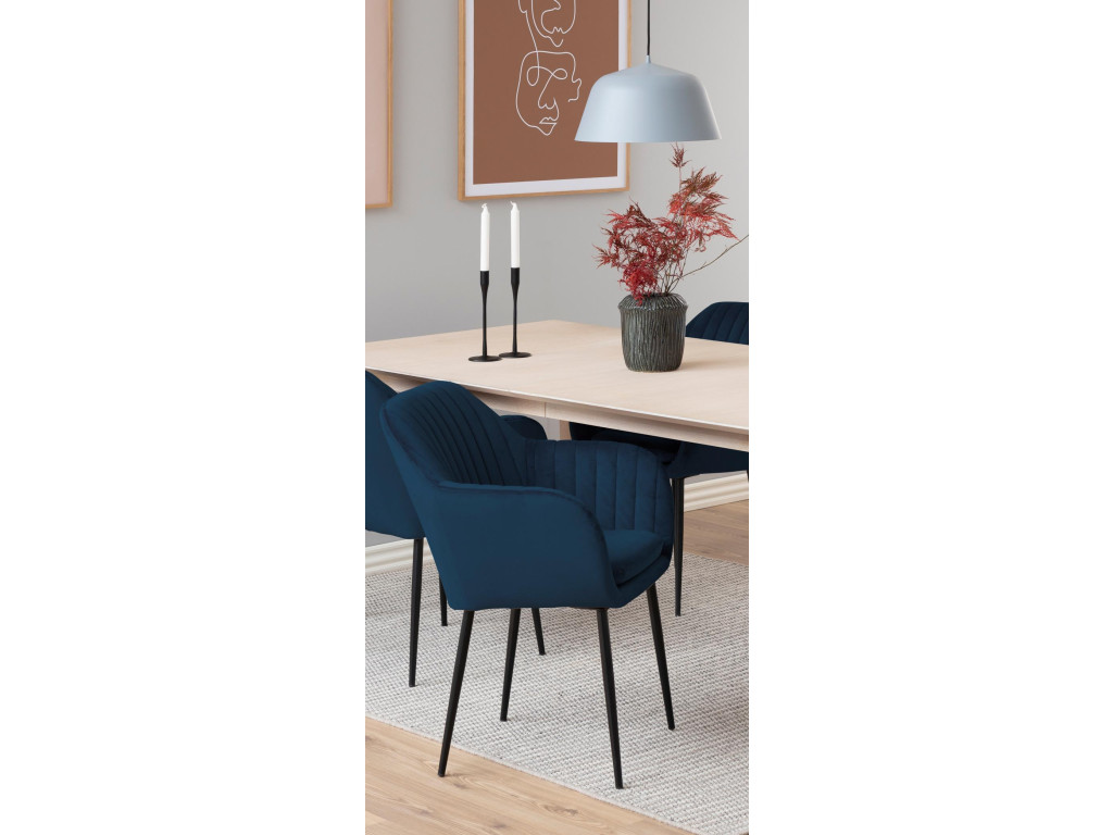 Kreslo Emilia v tmavomodrej látke kombinuje komfort a moderný dizajn. Pevná čierna oceľová základňa spolu s zvislým prešívaním a lakťovými opierkami zabezpečuje pohodlie pri dlhšom sedení. Je vhodné do jedálenských kútov aj kancelárií. Elegantné čalúnenie dodáva kreslu štýlový vzhľad.