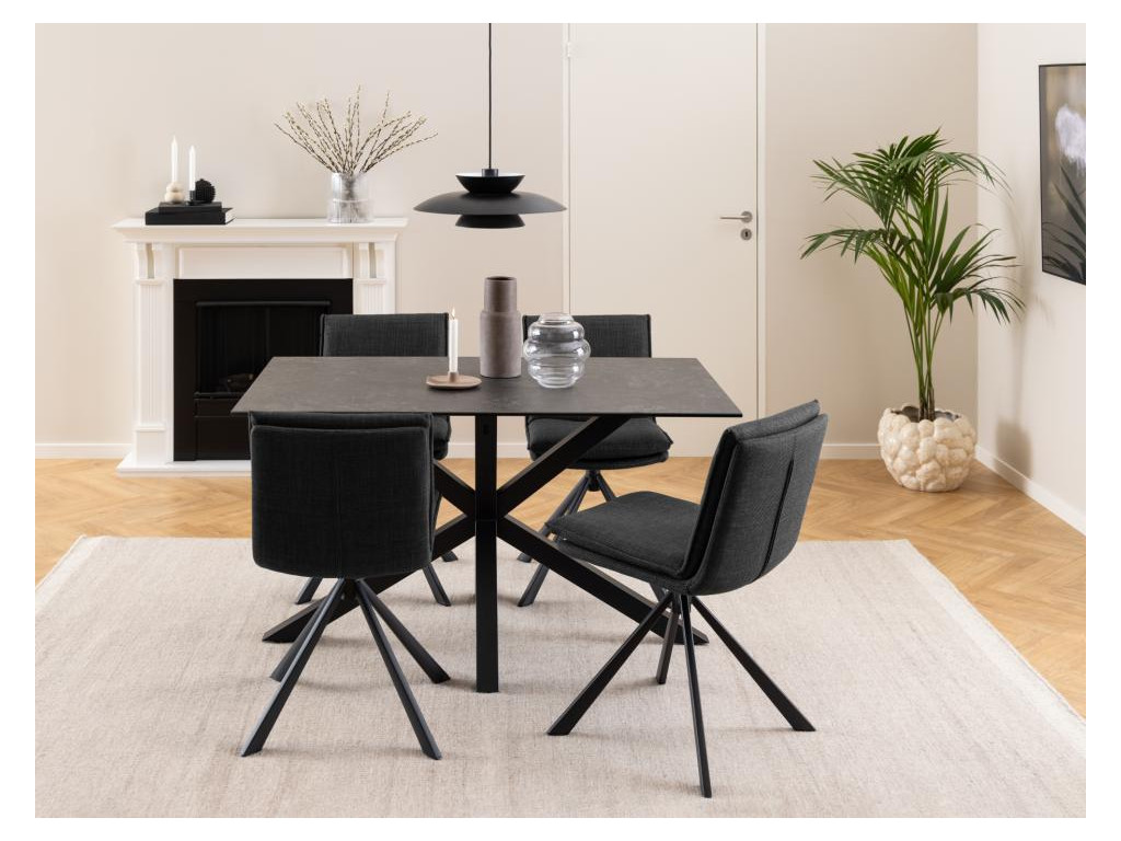 Jedálenská stolička Flynn v tmavosivej farbe prináša moderný vzhľad s praktickým využitím. Otočná čierna kovová základňa umožňuje jednoduché natáčanie pri stole. Vďaka čalúneniu je sedenie pohodlné aj počas dlhších večerí. Perfektne doplní interiér v neutrálnych odtieňoch.