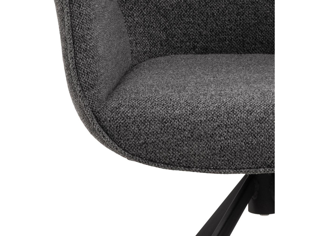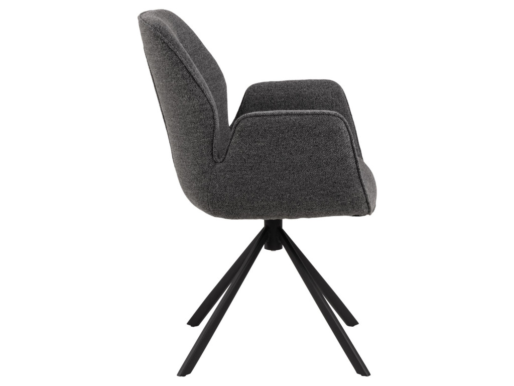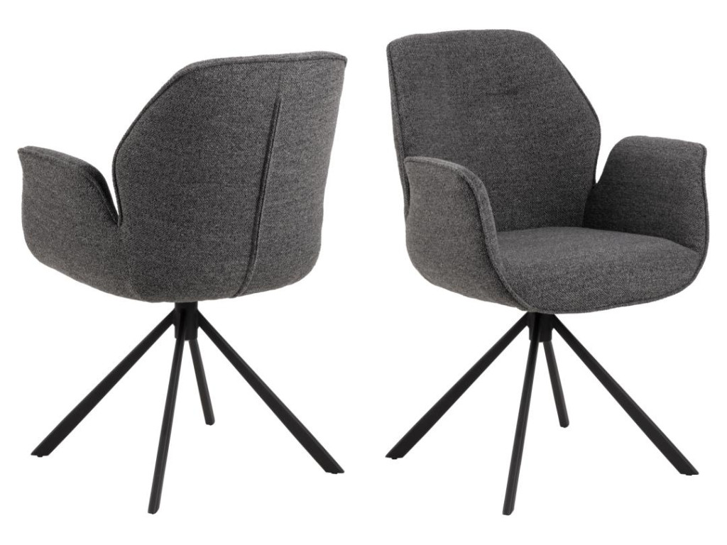 Kreslo Aura s lakťovou opierkou v antracitovej látke pôsobí moderne a komfortne. Otočný podstavec z čiernej ocele dodáva praktickosť. Vhodné do moderne zariadených jedální alebo obývacích priestorov.