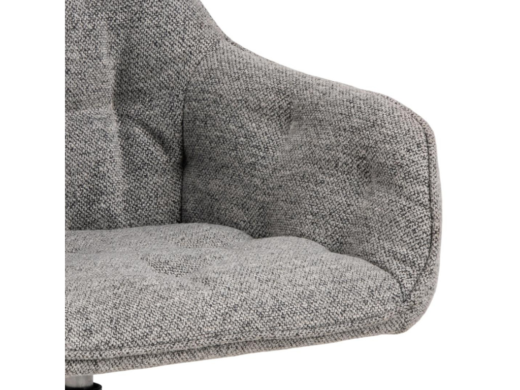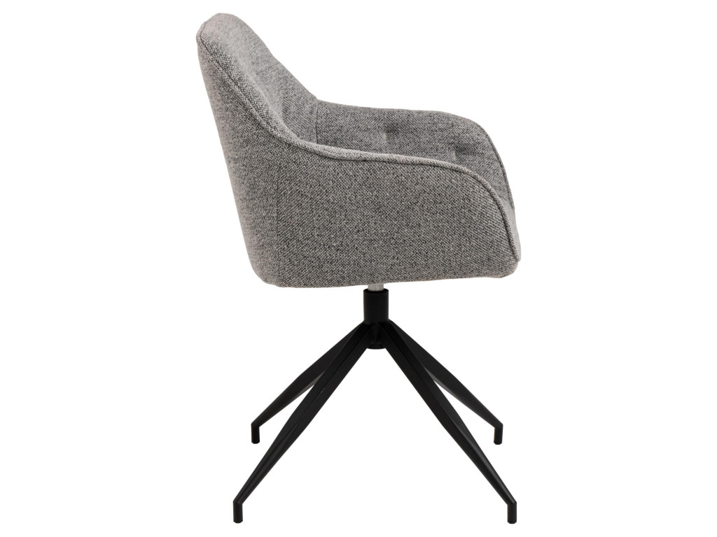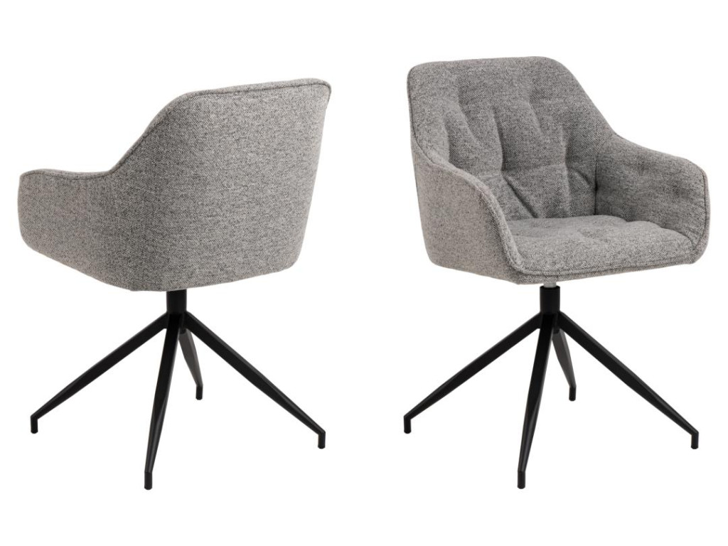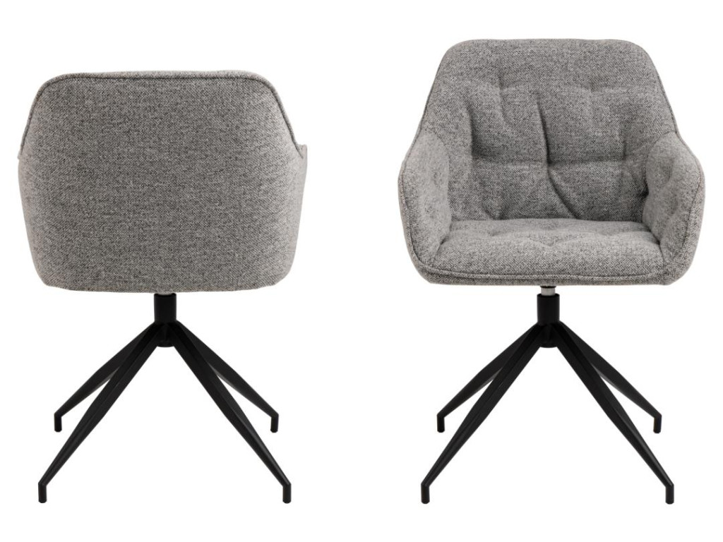 Kreslo Brooke v sivej farbe ponúka pohodlie pri každom stolovaní. Čierna oceľová podnož je pevná a zároveň štýlová. Vďaka otočnej funkcii a čalúneniu je stolička ideálna na dlhé večere alebo stretnutia pri stole.