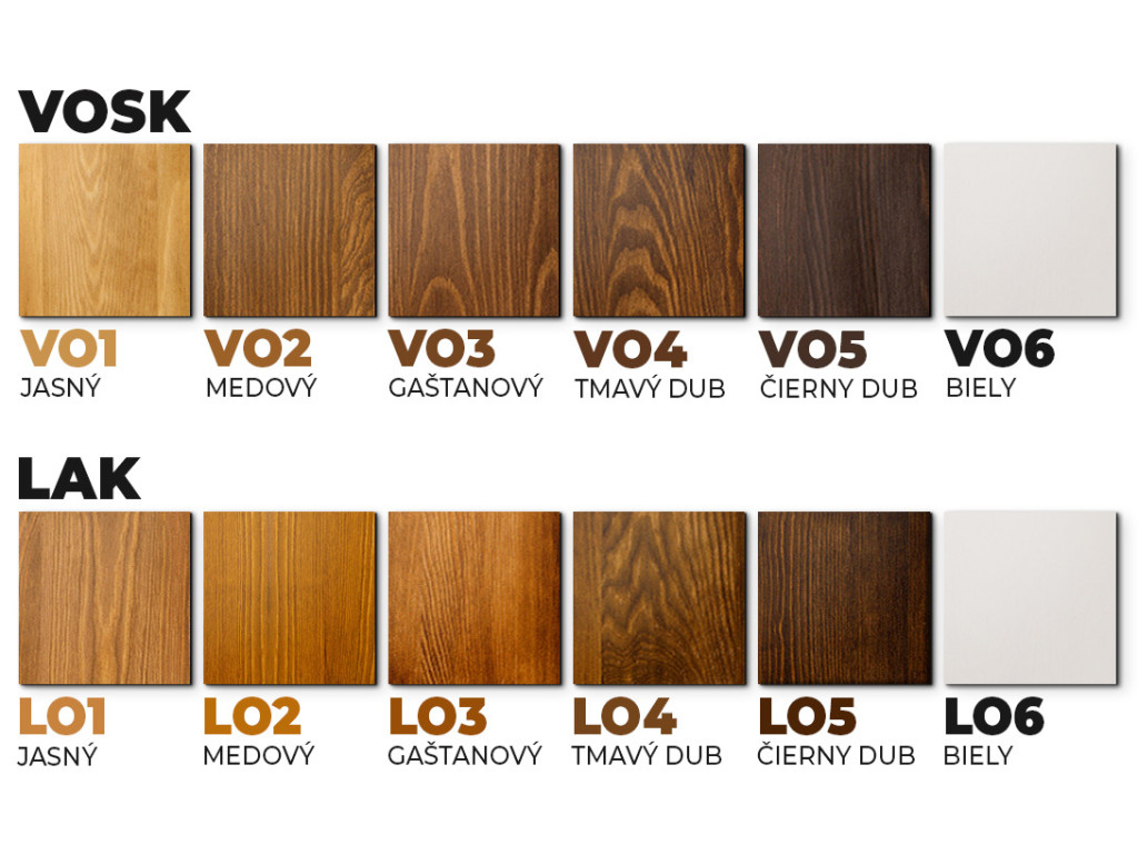 Povrchovú úpravu stola si môžete zvoliť podľa vlastných predstáv. Na výber máte nielen množstvo farieb, ale môžete si vybrať aj úpravu vosk alebo lak. Prekrytie povrchu ekologickým lakom dodatočne chráni pred mechanickým poškodením. Kresba dreva je plne zachovaná.