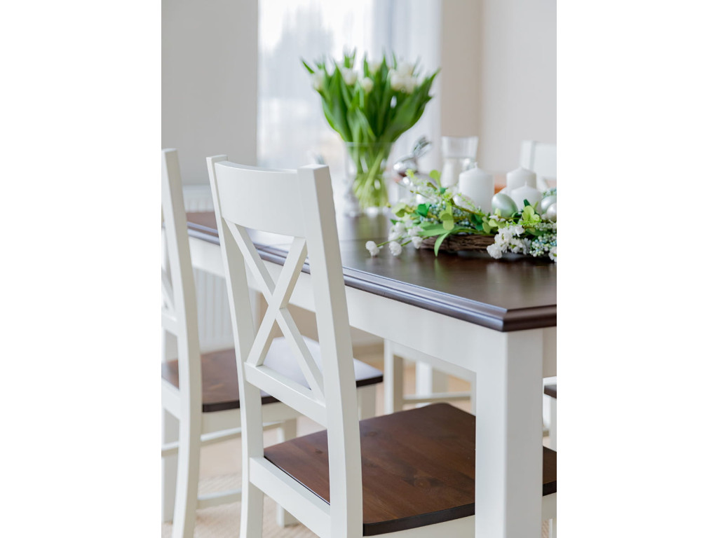Prírodný materiál fínska borovica má vplyv nielen na jemný vzhľad, ale aj na kvalitu výrobku. Borovicový stôl je veľmi odolný a jeho pevné nohy mu dodávajú mimoriadnu pevnosť. Napriek tomu, že povrch dreva bol pokrytý bielou farbou na vodnej báze (85% krytie), prstence v dreve sú stále viditeľné. To je asi najväčšia výhoda nábytku z prírodného dreva. Farba vrchnej dosky stola je orech.