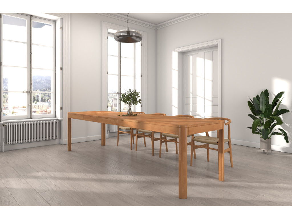 Jednou z hlavných predností je jeho flexibilita – stôl s pôvodnou dĺžkou 140 cm môžete vďaka synchrónnym vodidlám bez námahy roztiahnuť až na 260 cm. S tromi samostatnými vložkami uloženými mimo stola je rozkladanie jednoduché a intuitívne, čo oceníte pri každom väčšom stretnutí. Jedinečný dizajn zaoblených nôh dodáva stolu moderný škandinávsky štýl a stabilitu, pričom hrúbka dosky 2,5 cm poskytuje pevnú základňu pre každé stolovanie.