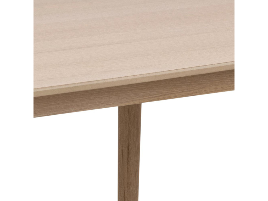 Jedálenský stôl Aston má obdĺžnikový tvar a elegantný bielený dubový vzhľad. Pripravený na rozšírenie vďaka prídavným doskám. Stabilná konštrukcia je ideálna pre rodinné stolovanie. Povrch je ošetrený olejom pre dlhú životnosť a jednoduchú údržbu.