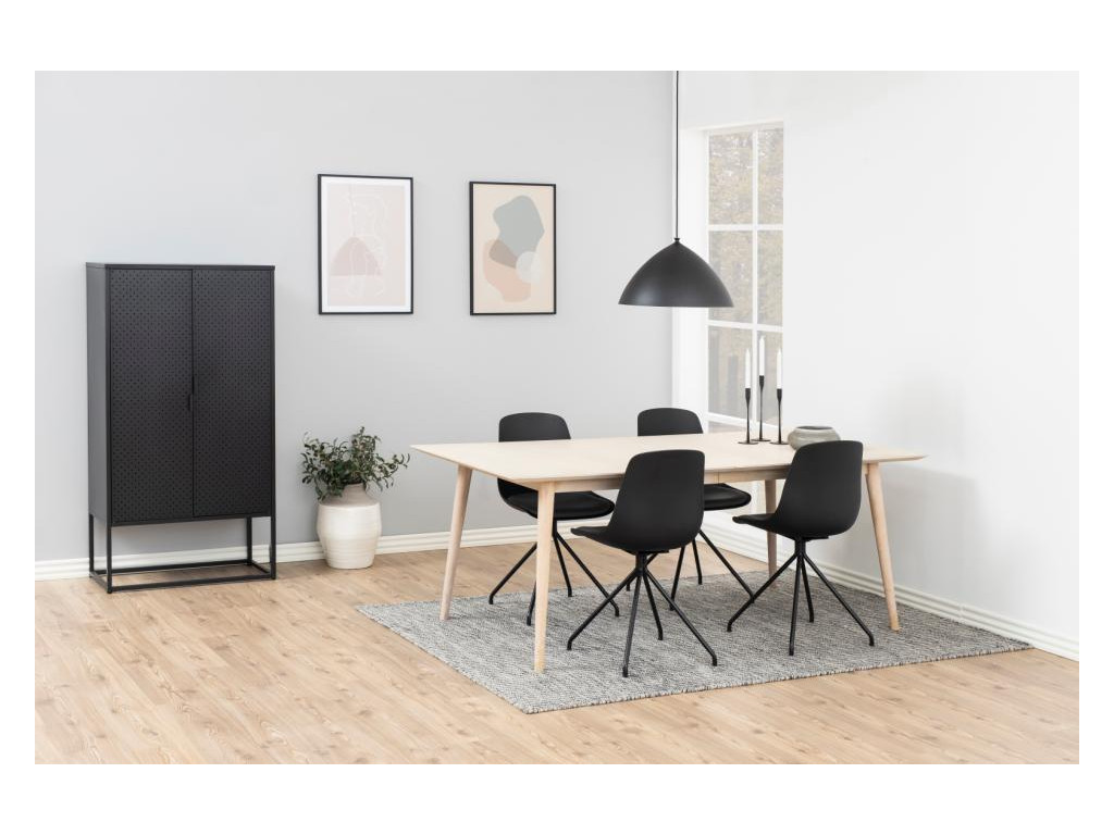 Priestranný stôl Century vnáša do jedálne čistý škandinávsky minimalizmus: hladká obdĺžniková doska z bielo pigmentovanej olejovanej dubovej dyhy nechá vyniknúť prirodzenú kresbu dreva, kým subtílne, zaoblené dubové nohy zdvihnú celú siluetu a dodajú priestoru ľahkosť. Vnútri podnožia sa ukrýva diskrétny úložný priestor na prídavné dosky (predávajú sa samostatne), takže stôl môžete jedným ťahom predĺžiť a pohodlne usadiť viac hostí – ideálny spoločník na rodinné oslavy aj pokojné všedné večere.