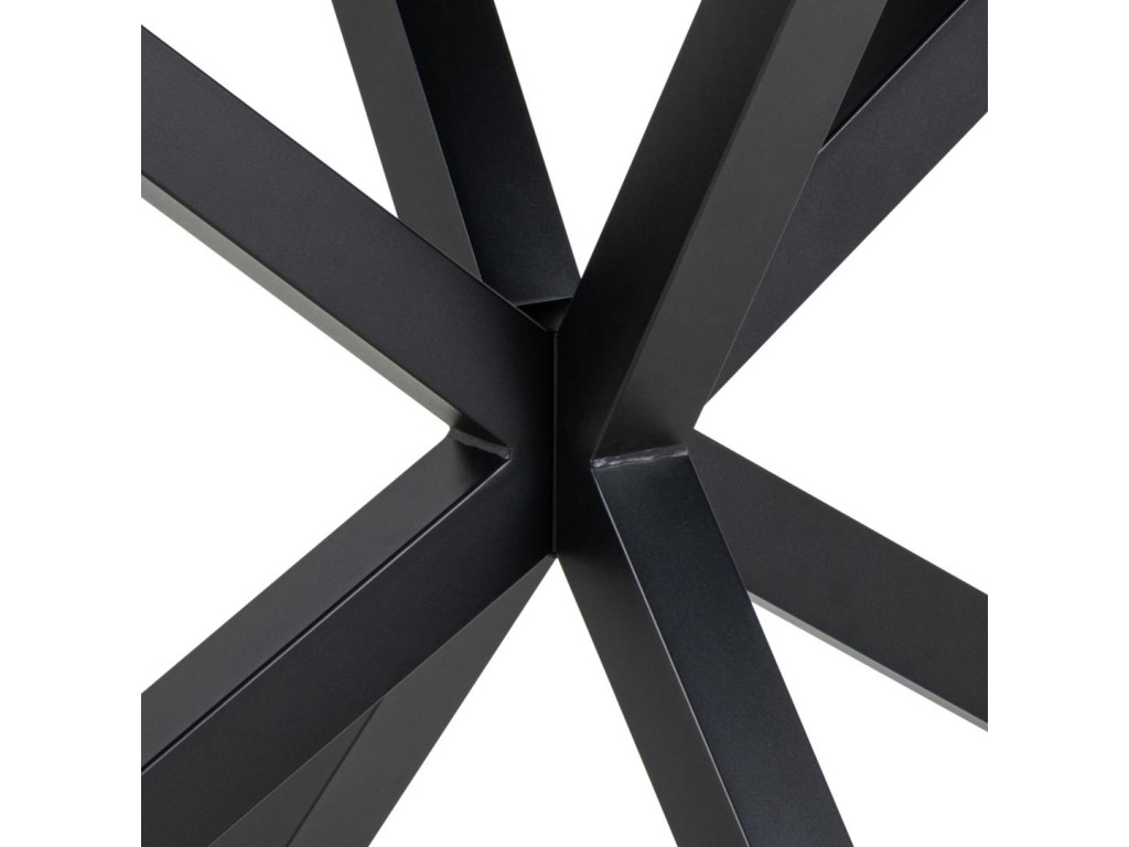 Matná čierna oceľová podnož v tvare kríža dodáva stolu sochársky nádych a stabilitu. Je ideálny pre menšie priestory a pohodlne usadí 4 osoby.