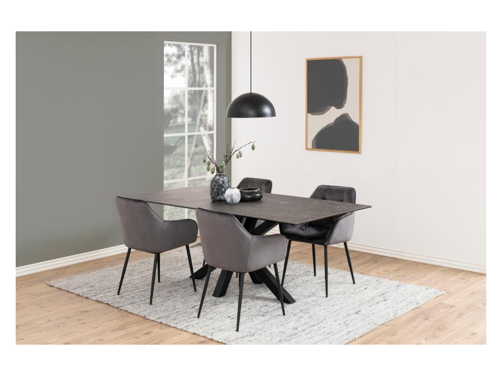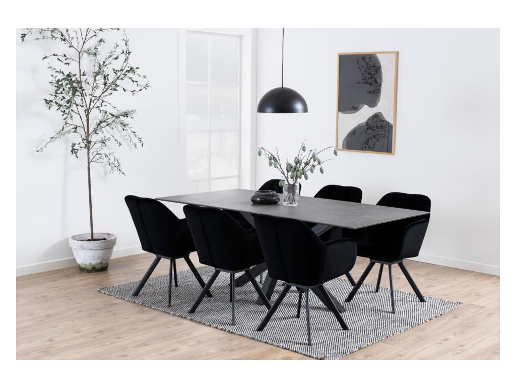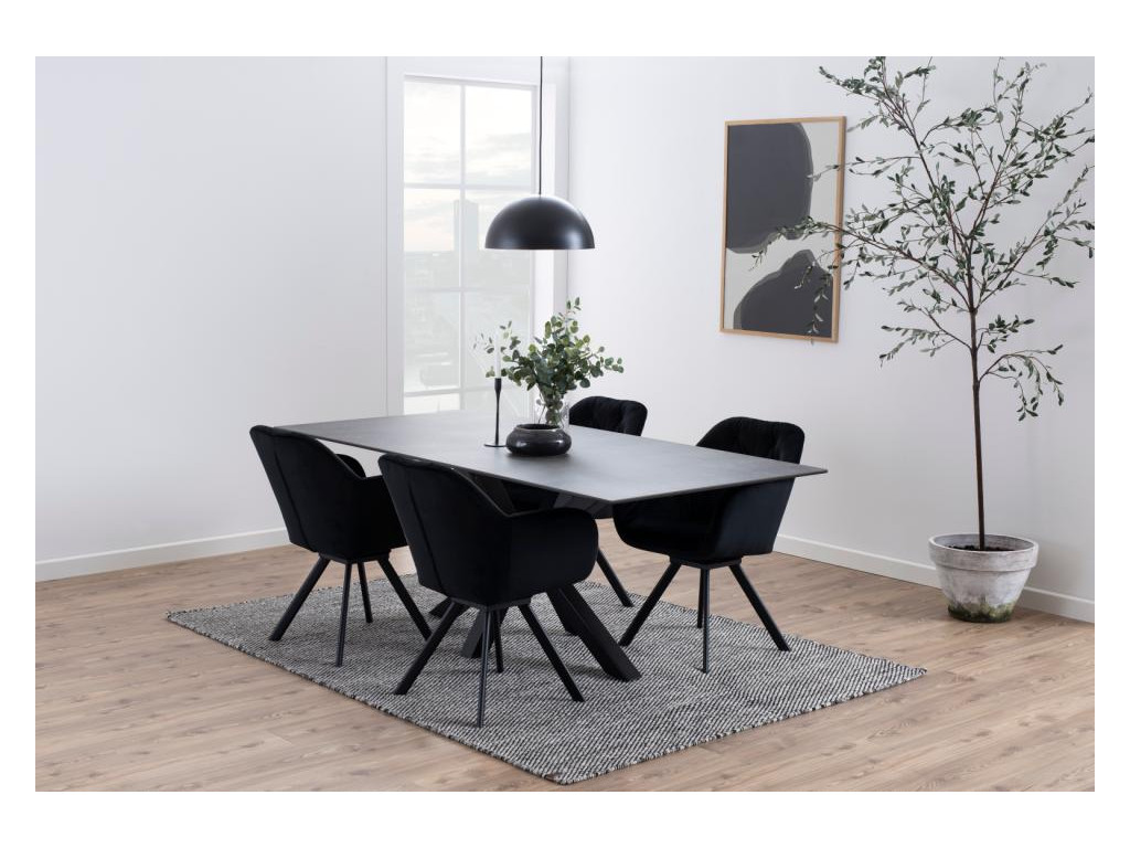 Jedálenský stôl Heaven je pôsobivým stredobodom modernej domácnosti. Jeho rozmerná keramická doska v čiernom prevedení Fairbanks ponúka rafinovaný vzhľad s praktickými vlastnosťami – je odolná voči teplu aj poškriabaniu a výborne sa udržiava. 4-ramenná sochárska podnož z matnej čiernej ocele s hrubým práškovým nástrekom dotvára industriálny charakter a poskytuje výbornú stabilitu.