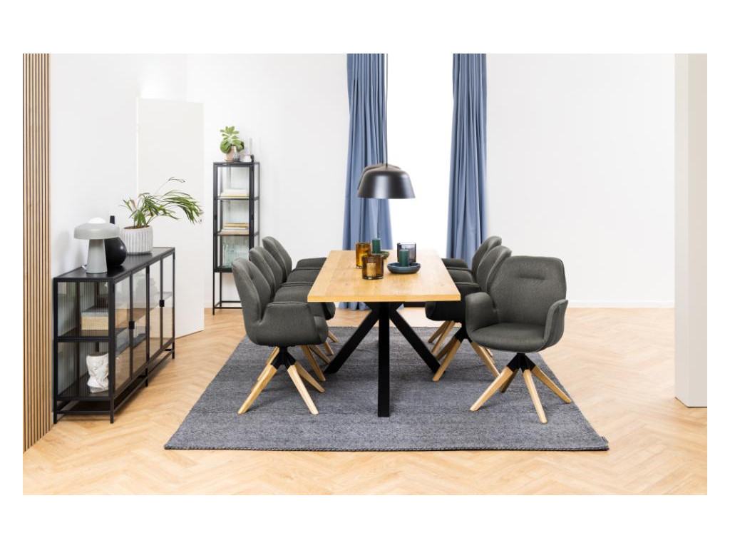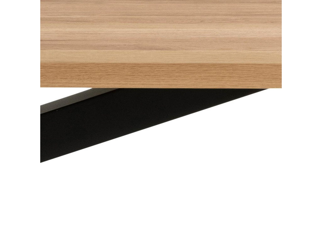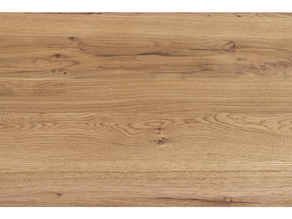 Tento veľkorysý jedálenský stôl spája rustikálnu prírodnú krásu s moderným minimalizmom. Doska z dyhy z divokého duba s olejovaným povrchom pôsobí prirodzene a hrejivo, pričom zvýrazňuje jedinečný charakter dreva. Robustná krížová základňa z matnej čiernej ocele s hrubým práškovým nástrekom dodáva stolu výrazný kontrast a sochársku siluetu.