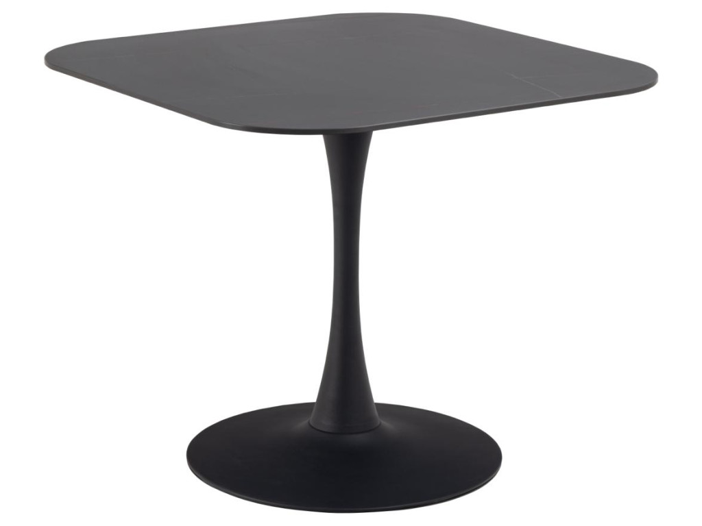 Štvorcový keramický stôl Malten s matne čiernou povrchovou úpravou a industriálnou kovovou základňou pôsobí masívne a elegantne. Vhodný na každodenné použitie. Rozmery: 90 × 90 × 75 cm.