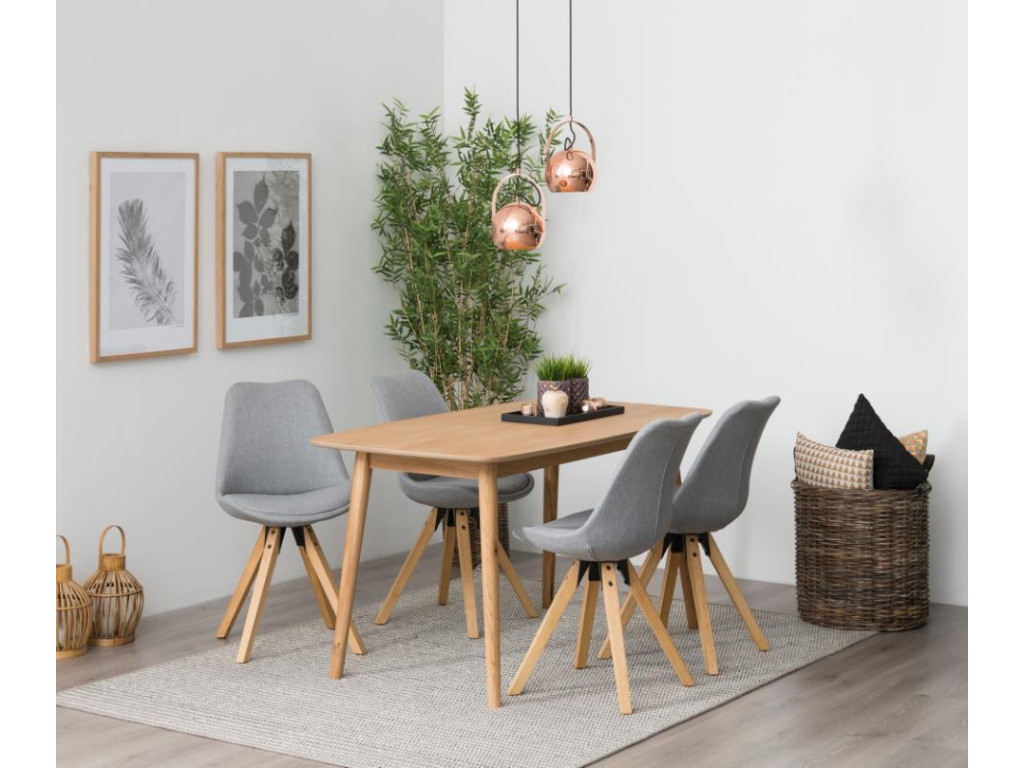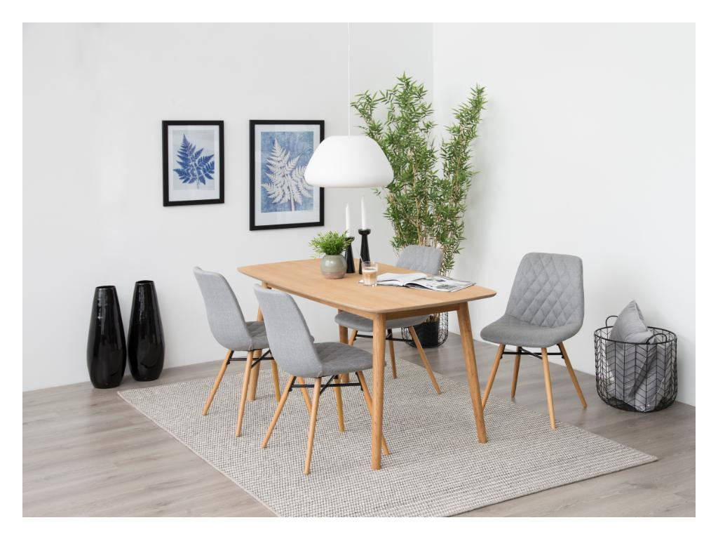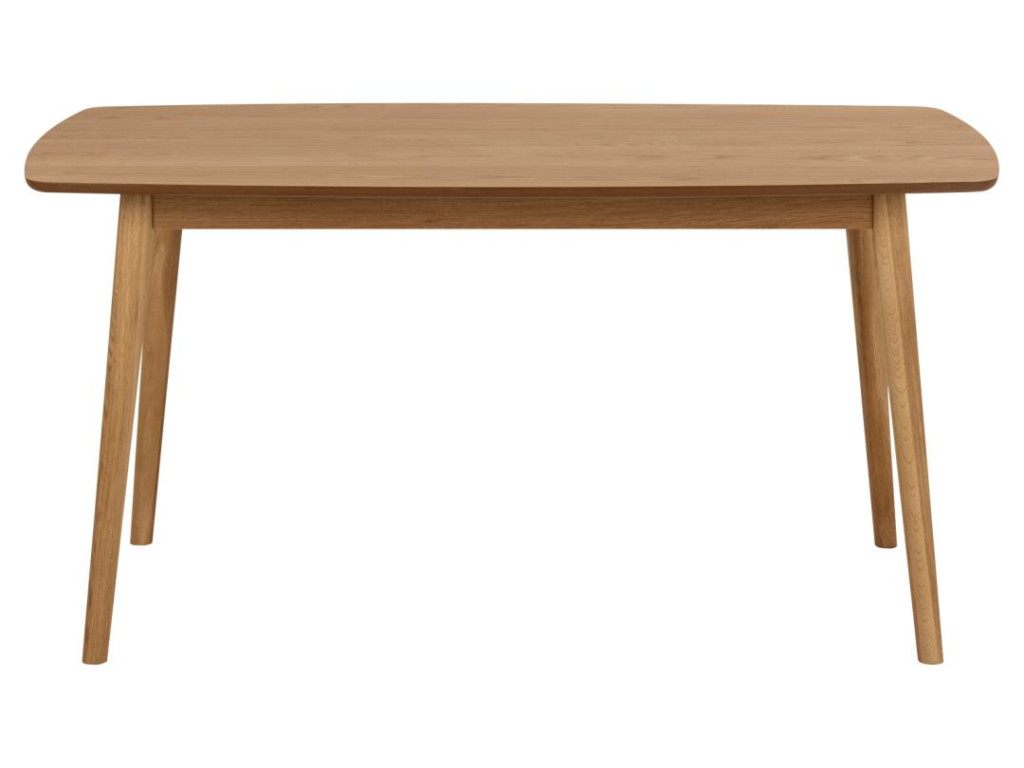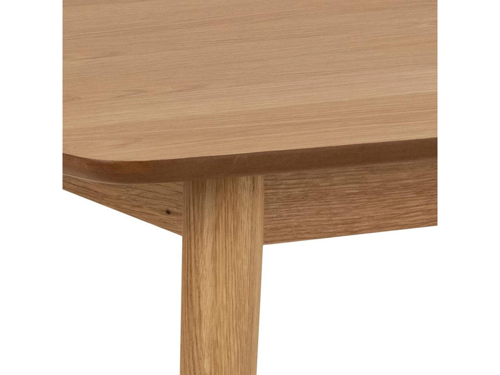 Obdĺžnikový stôl s vrchnou doskou z olejovanej dubovej dyhy a masívnou dubovou základňou v prírodnom odtieni. Rozmer 150 × 80 × 75,5 cm zabezpečuje pohodlné stolovanie aj pre väčšiu rodinu. Jeho hranatý tvar pôsobí vyvážene a prirodzene. Skvelo sa hodí do škandinávsky ladených interiérov.