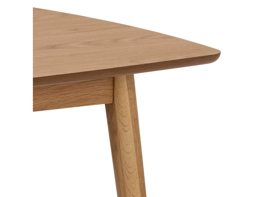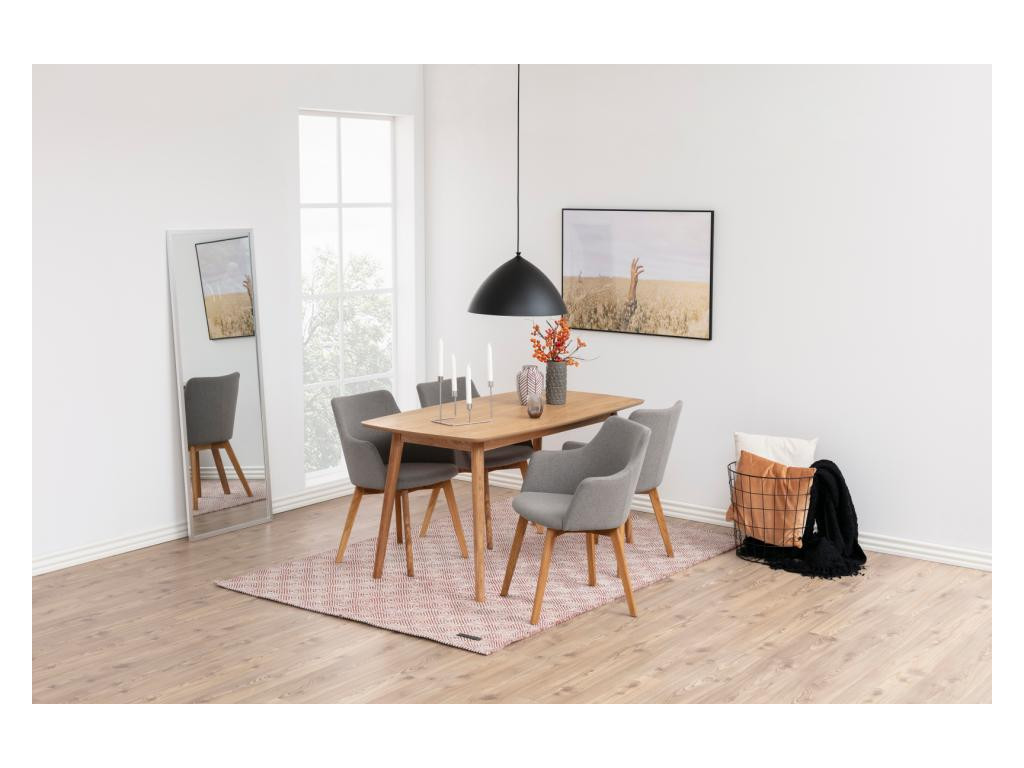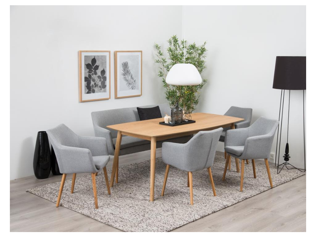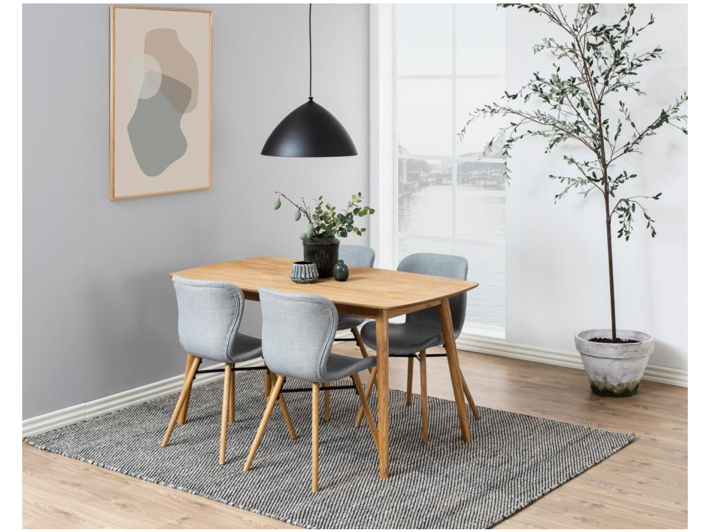 Obdĺžnikový stôl s vrchnou doskou z olejovanej dubovej dyhy a masívnou dubovou základňou v prírodnom odtieni. Rozmer 150 × 80 × 75,5 cm zabezpečuje pohodlné stolovanie aj pre väčšiu rodinu. Jeho hranatý tvar pôsobí vyvážene a prirodzene. Skvelo sa hodí do škandinávsky ladených interiérov.