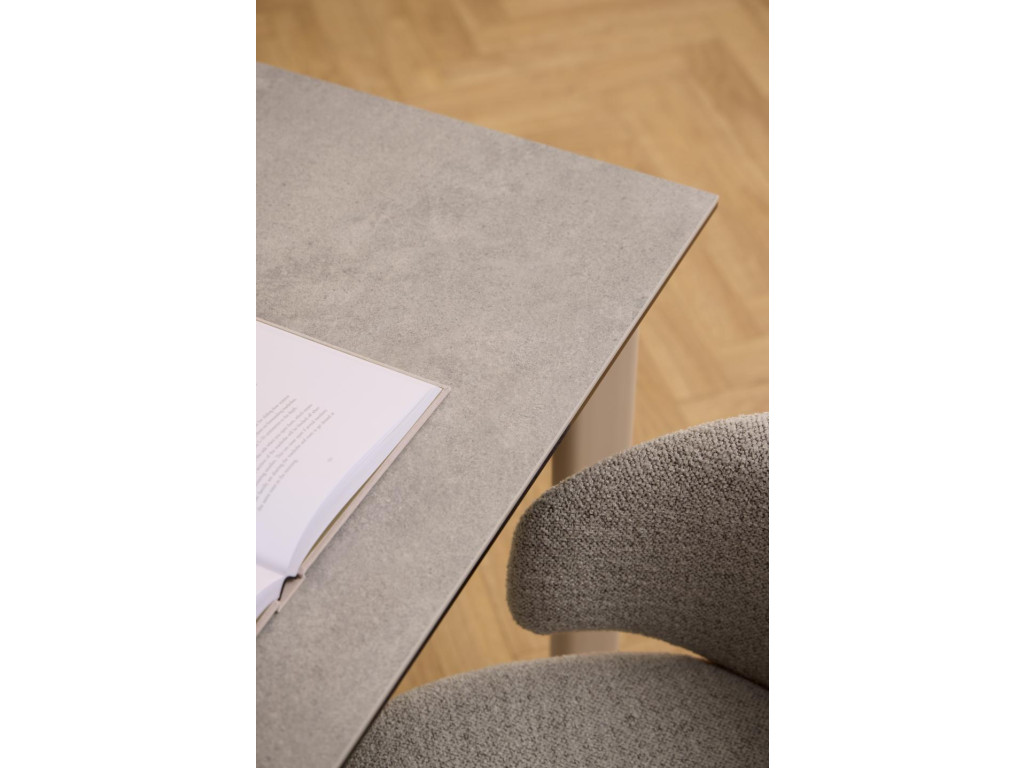 Jedálenský stôl Palermo spája minimalistický dizajn s praktickými materiálmi – je ideálnou voľbou pre tých, ktorí oceňujú vizuálnu čistotu a nenáročnú údržbu. Vďaka svojej sivej keramickej doske s jemným surovým povrchom pôsobí stôl elegantne a zároveň odolne. Podopiera ju sivá kovová podnož s rovnými líniami, ktoré zvýrazňujú celkový moderný vzhľad.