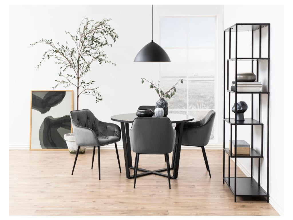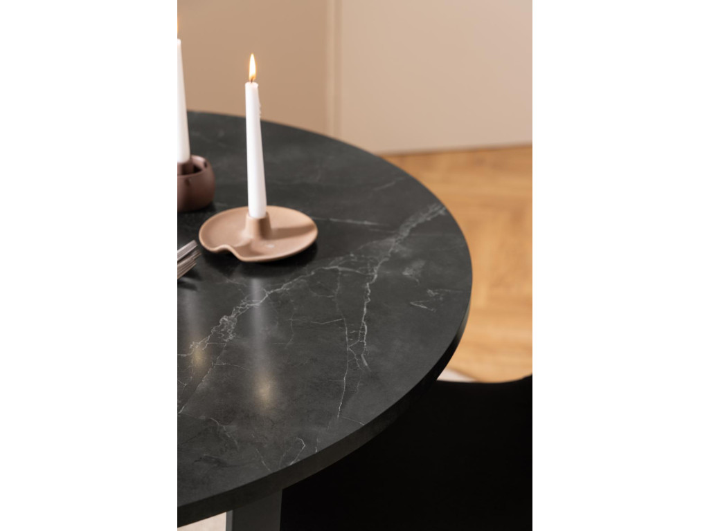 Stôl Amble s čiernym mramorovým povrchom a kovovou základňou v čiernej farbe vytvára elegantný a zároveň odolný stredobod jedálne. Jeho okrúhly tvar podporuje komunikáciu pri stole a vyniká v moderných interiéroch.