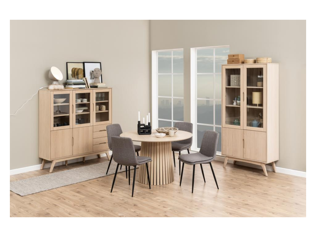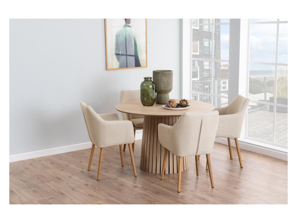 Moderný jedálenský stôl Christo prináša do interiéru prirodzenú krásu škandinávskeho dizajnu. Jeho okrúhla stolová doska a výrazná kužeľovitá stredová základňa s lamelovým efektom sú vyrobené z dubovej dyhy s bielym pigmentom, ktorá jemne zosvetľuje prirodzený vzhľad dreva. Stôl poskytuje dostatok priestoru pre pohodlné stolovanie štyroch osôb a vďaka svojej forme zvyšuje pocit vzdušnosti a rovnosti pri sedení.
