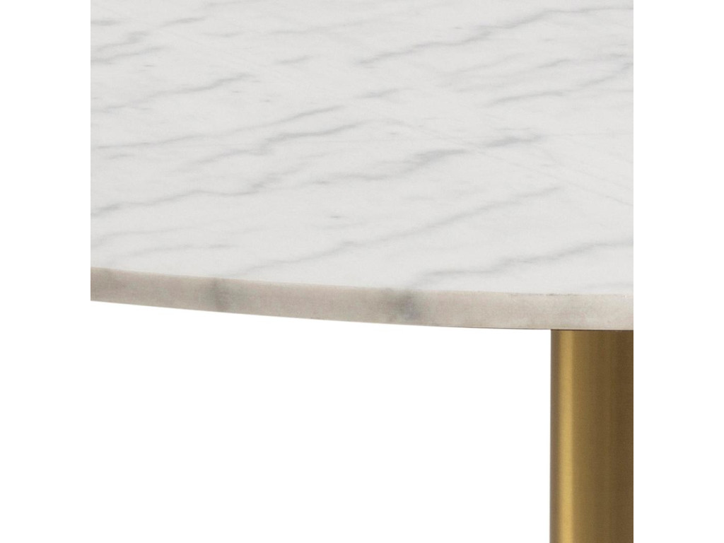Stôl Corby s bielym mramorom a zlatou oceľovou základňou vytvára luxusný a elegantný dojem. Okrúhly tvar je ideálny pre menšie priestory, kde podčiarkne štýl a zároveň ponúkne pohodlné sedenie. Perfektný do dizajnových interiérov.