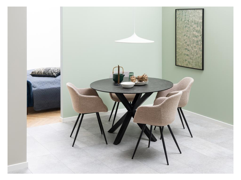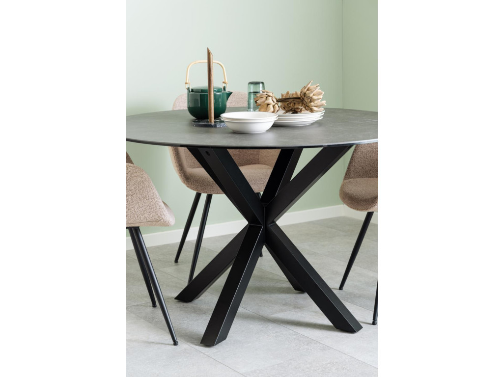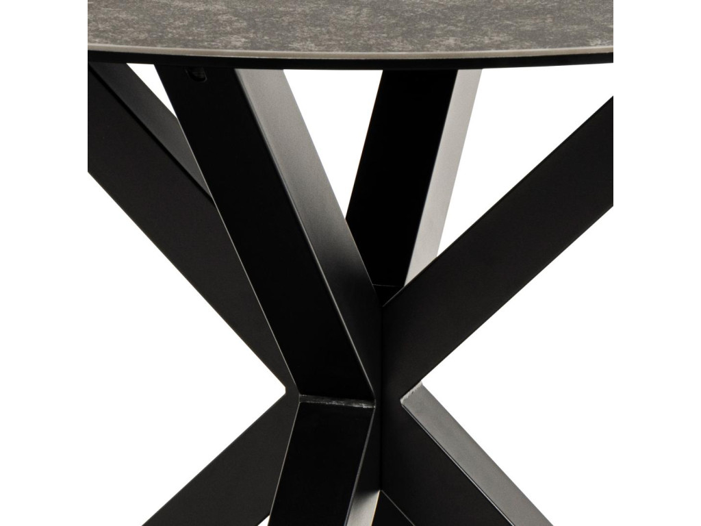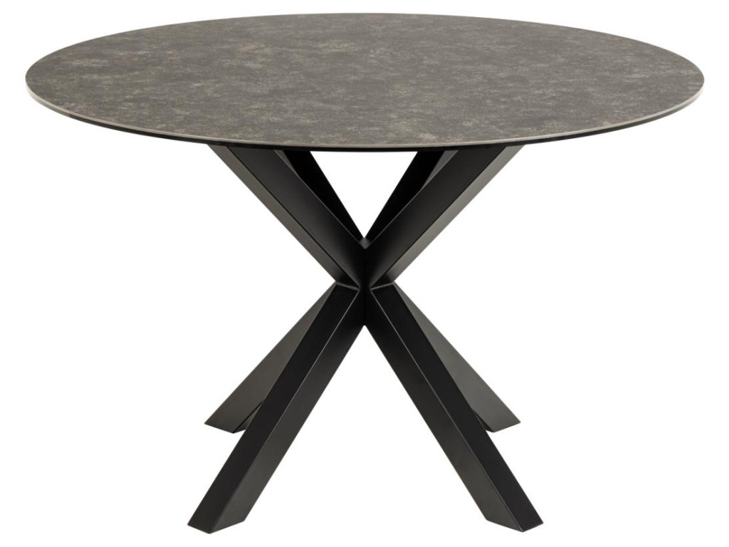 Jedálenský stôl Heaven s čiernou keramickou doskou a kovovou krížovou základňou prináša elegantnú jednoduchosť a odolnosť. Jeho okrúhly tvar sa hodí do moderných aj industriálnych interiérov a vďaka pevnej konštrukcii je vhodný aj na každodenné používanie.