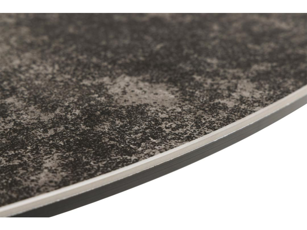 Zdieľanie domáceho jedla s blízkymi môže byť s týmto jedálenským stolom ešte útulnejšie. Pohodlne sa zaň usadia 4 osoby a jeho charakter udáva tmavá keramická doska s drsným povrchom a vzhľadom čierneho mramoru Fairbanks, ktorá vytvára elegantný kontrast k čiernej, krížovo usporiadanej oceľovej podnoži. Vďaka keramickému materiálu odolnému voči teplu a poškriabaniu je stôl ideálny na každodenné používanie aj slávnostné príležitosti.