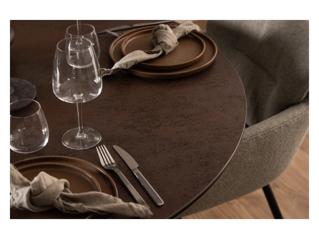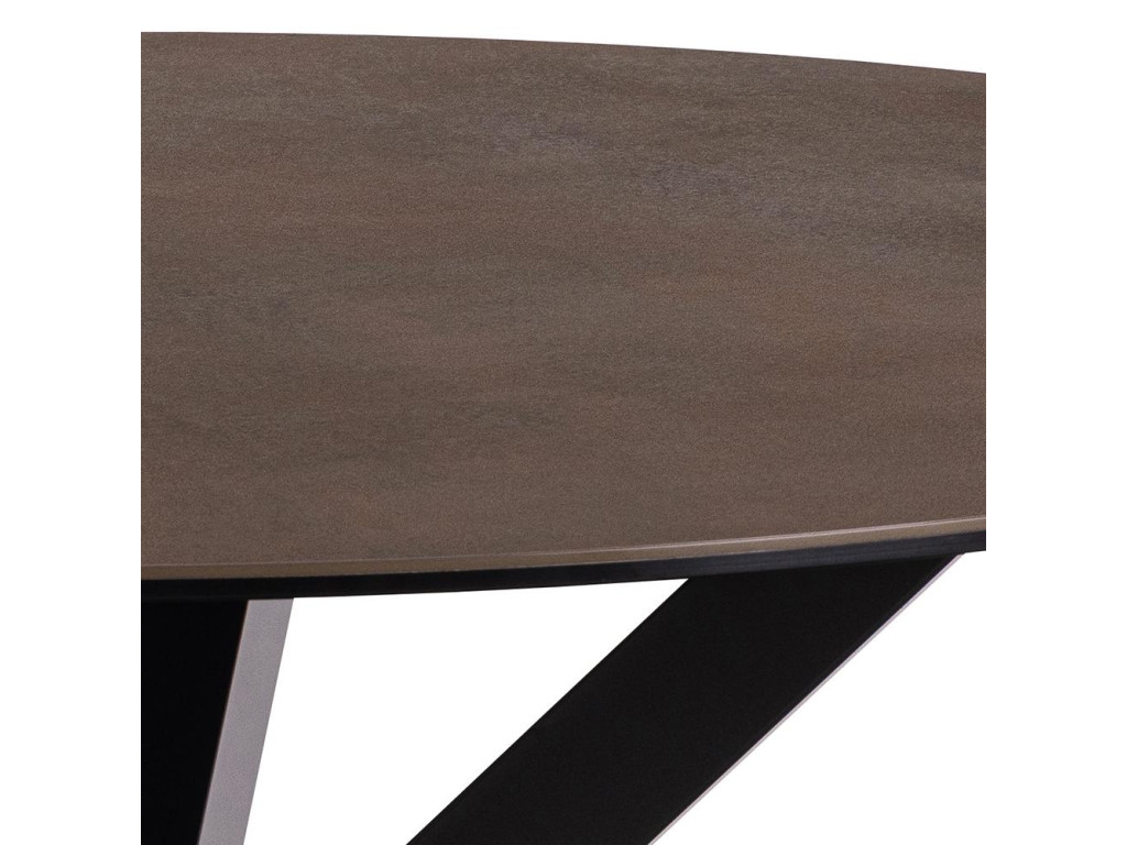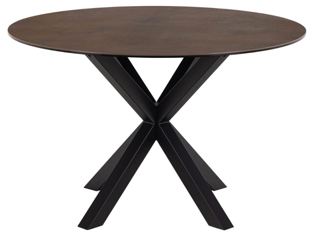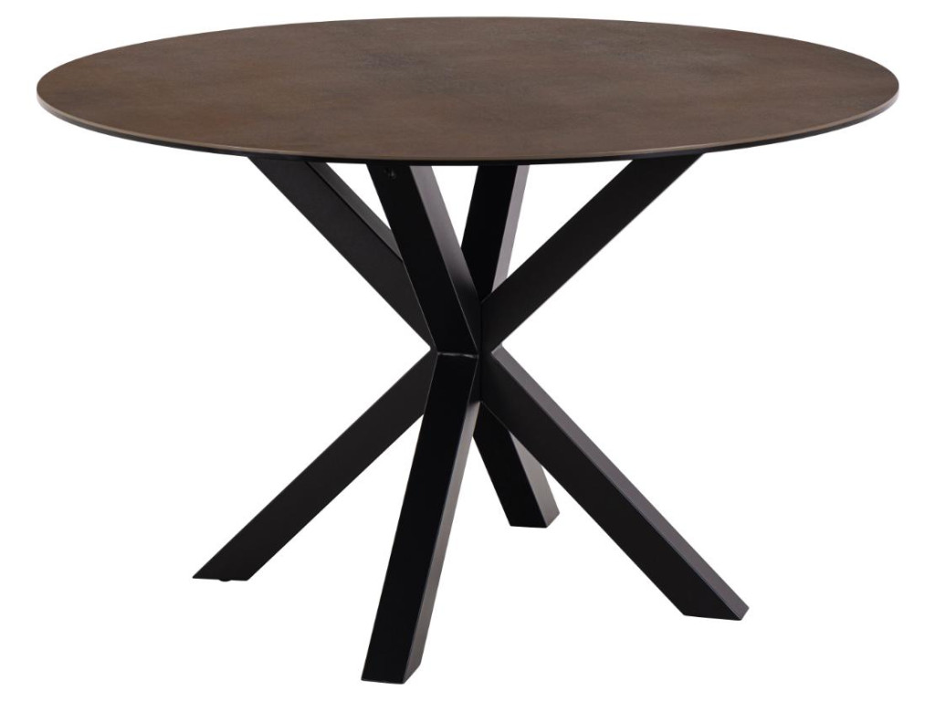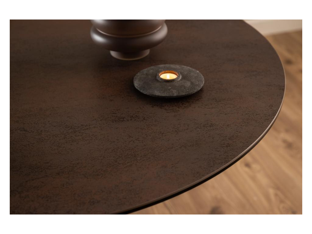 Okrúhly jedálenský stôl Heaven pôsobí vznešene a útulne vďaka keramickému povrchu v teplej hrdzavej farbe. Stabilná čierna kovová základňa v krížovej forme dodáva moderný akcent. Skvelý doplnok do menších priestorov alebo do jedální s kruhovým usporiadaním. Vytvára priateľskú atmosféru pri stole.