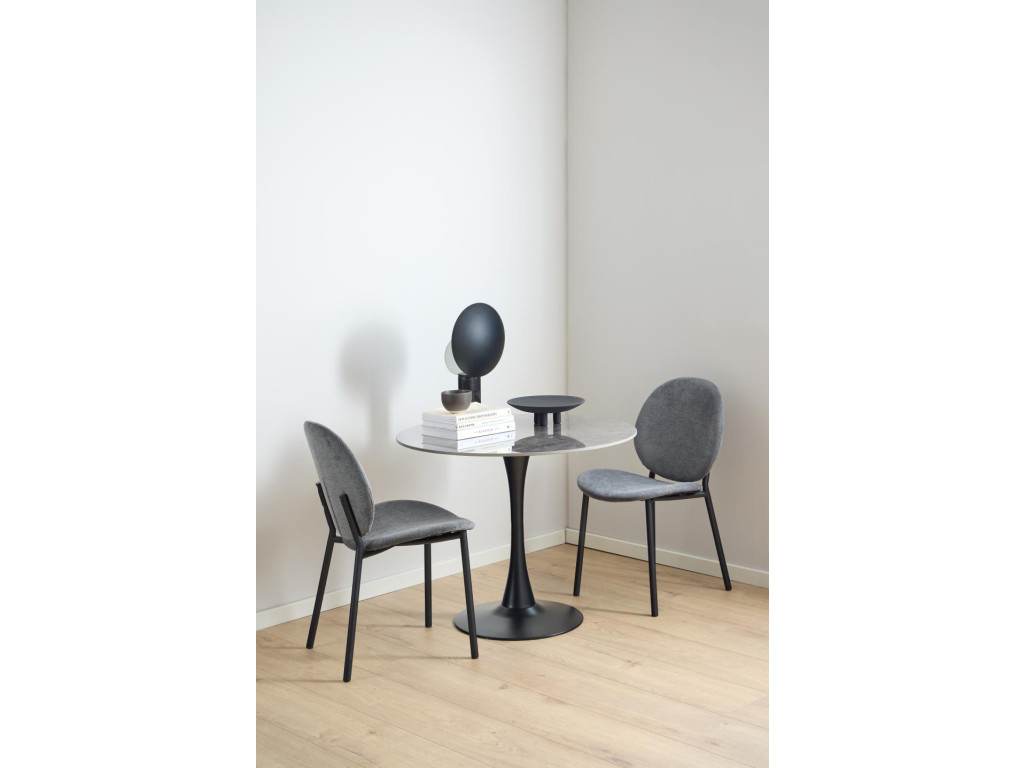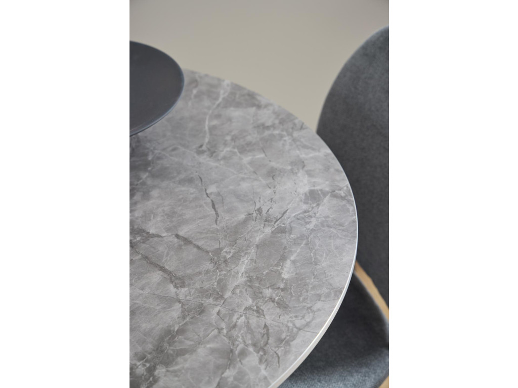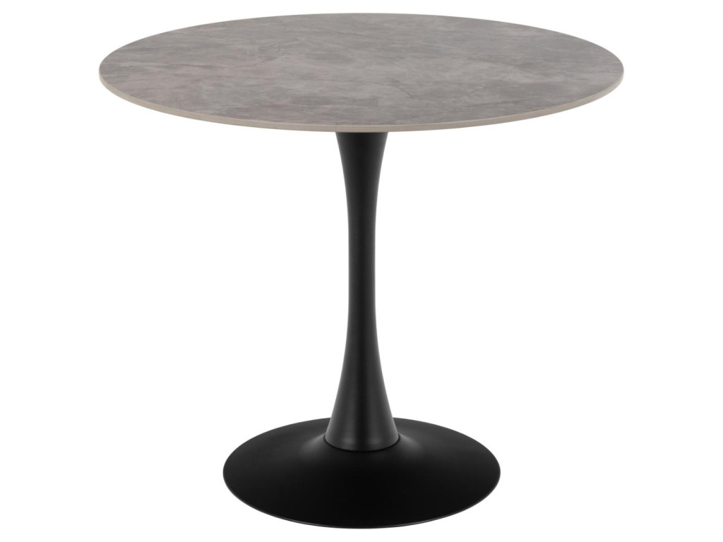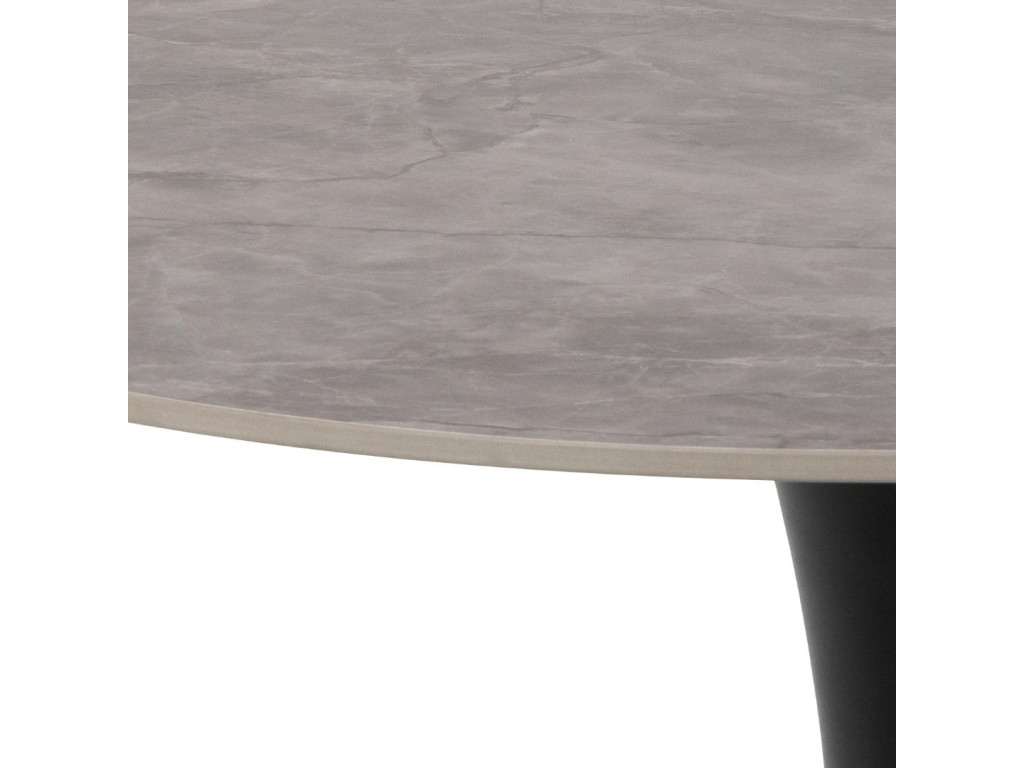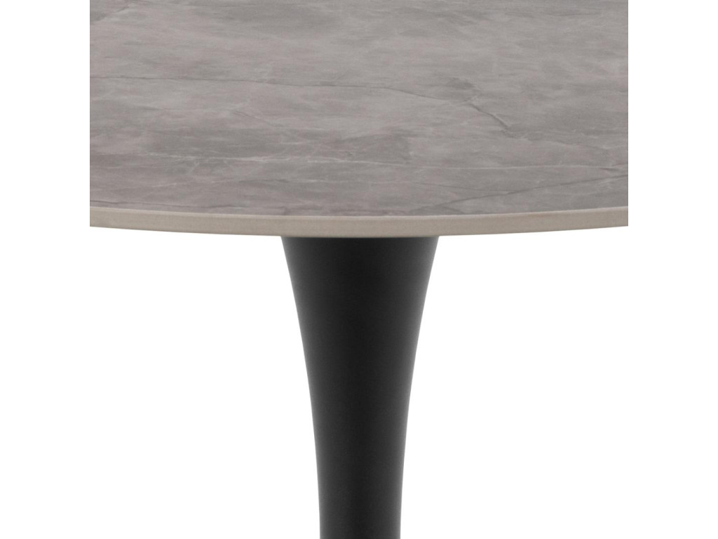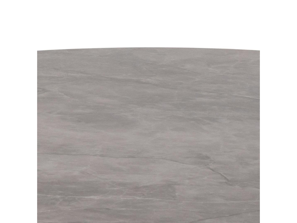 Sivá keramická doska v kombinácii s čiernou oceľou ponúka moderný vzhľad a vysokú odolnosť voči poškodeniu a teplu. Perfektný stôl pre 2–4 osoby. Rozmery: Ø90 × 75 cm.