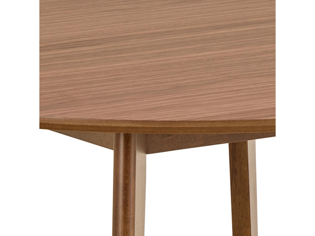 Elegantný okrúhly stôl Roxby s orechovou dyhou a drevenou podnožou, ideálny do menších priestorov. Vytvára útulnú atmosféru a pohodlne usadí 4 osoby.