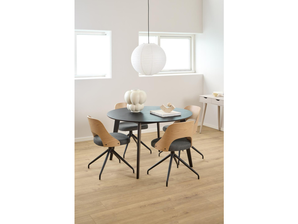 Okrúhly stôl Roxby v čiernom prevedení je vyrobený z matnej dubovej dyhy a stabilného kaučukového dreva. Vďaka okrúhlemu tvaru poskytuje rovnaký komfort zo všetkých strán. Je ideálny pre 4 osoby. Elegantný vzhľad vhodný pre moderné priestory.