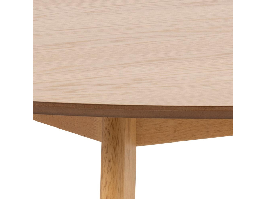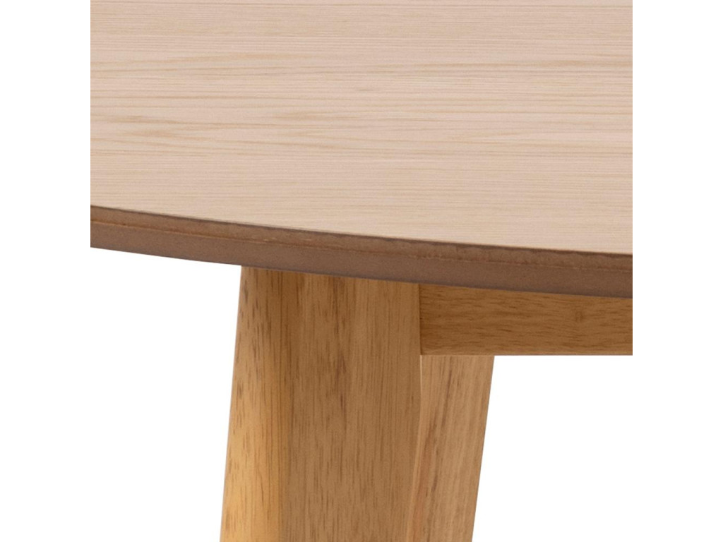 - Rozmery a základňa: Ø140 × 76 cm, výška nohy 74,2 cm, podnož 4-nohá s profilom s jemne zaoblenými hranami, materiál kaučukovník, farba matný morený dub, AC lak, plstené podložky