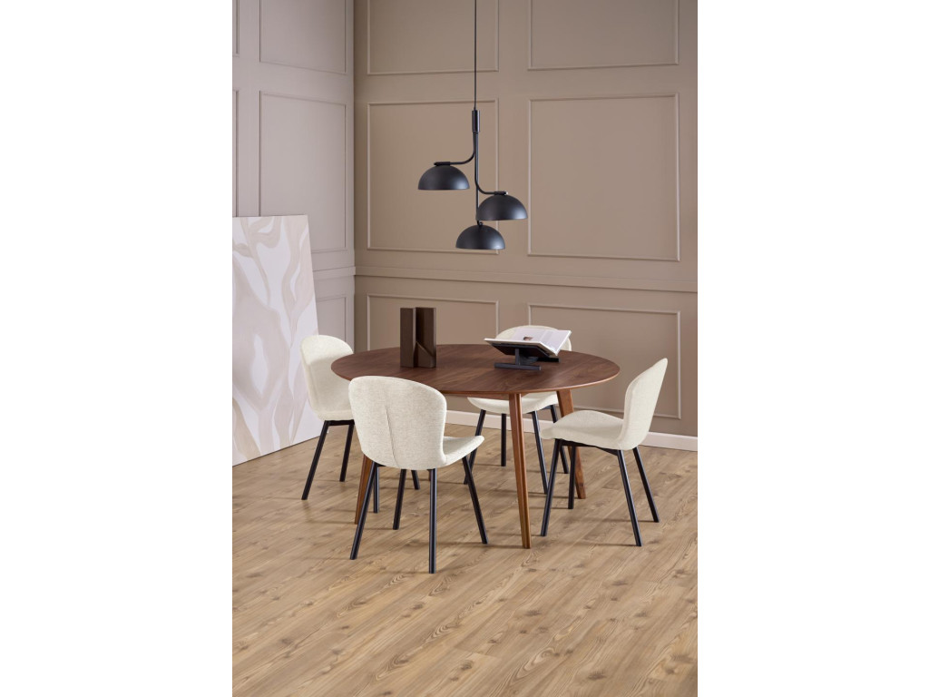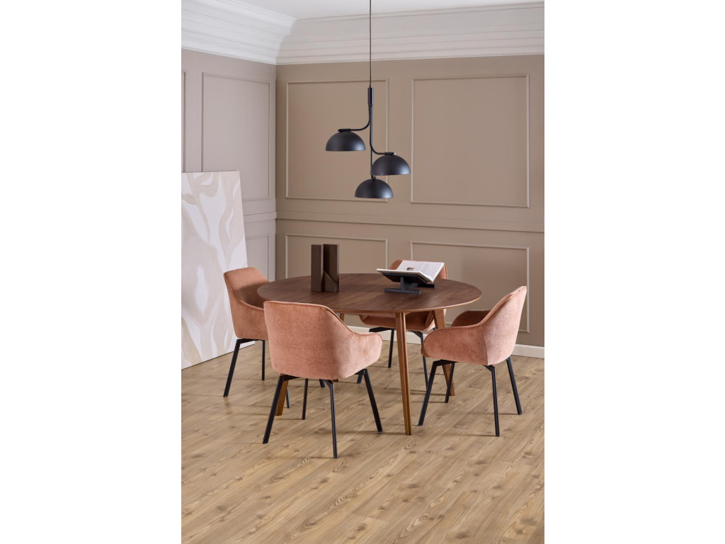 Tento elegantný okrúhly jedálenský stôl zaujme svojím teplým orechovým odtieňom a moderným čiernym kontrastom podnože. Je ideálny pre domácnosti, ktoré preferujú kombináciu prírodného štýlu a súčasného dizajnu. Okrúhly tvar navyše podporuje spoločenskú atmosféru počas stolovania.