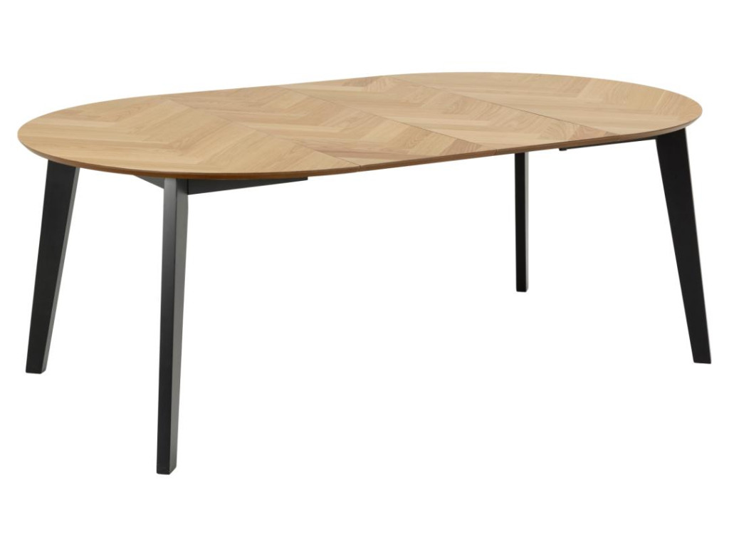 Vyniknite s jedálenským stolom Georgetown, ktorý spája klasiku vzoru rybej kosti s modernou severskou estetikou. Okrúhly tvar je ideálny do menších priestorov a vďaka dvom prídavným doskám jednoducho premeníte stôl na oválny variant až do 198 cm. Čierna lakovaná podnož z masívneho kaučukovníka dodáva stabilitu a kontrast k teplému tónu matného duba.